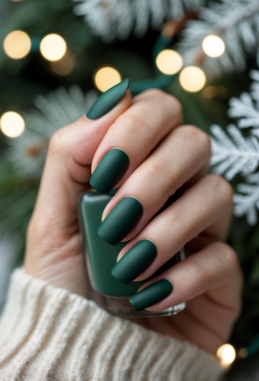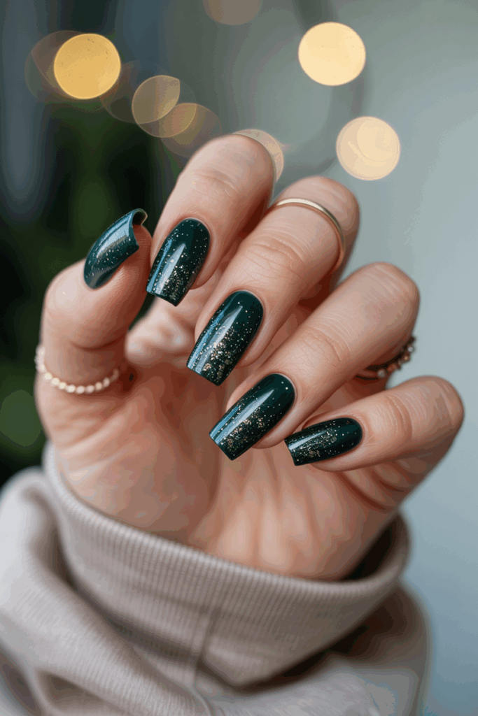 Glittery pine green accents bring a festive touch without being too bold. They work well as highlights on one or two nails. Adding subtle sparkle to pine green polish creates a simple, elegant holiday look.