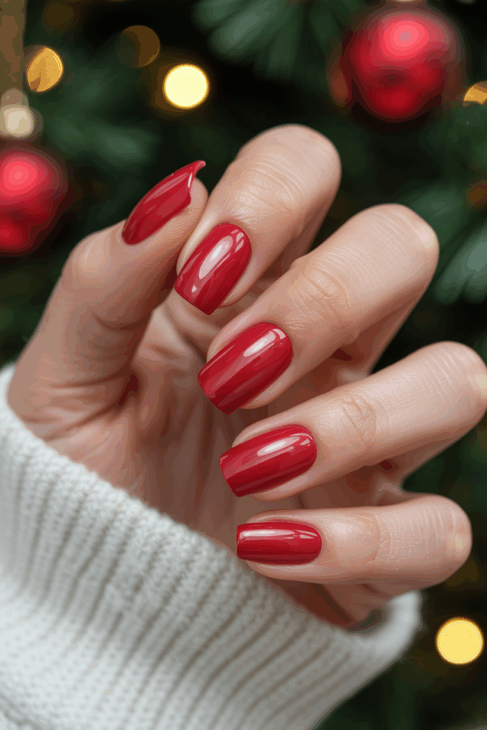 This look features a vibrant red polish that suits any holiday outfit.