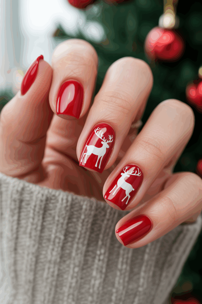 This nail design features simple reindeer shapes painted in dark colors like black or brown.