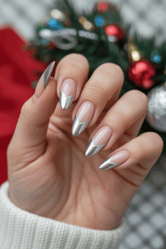 Frosty silver chrome tips add a sleek, modern touch to any manicure. The shiny finish catches light for a cool, icy look.