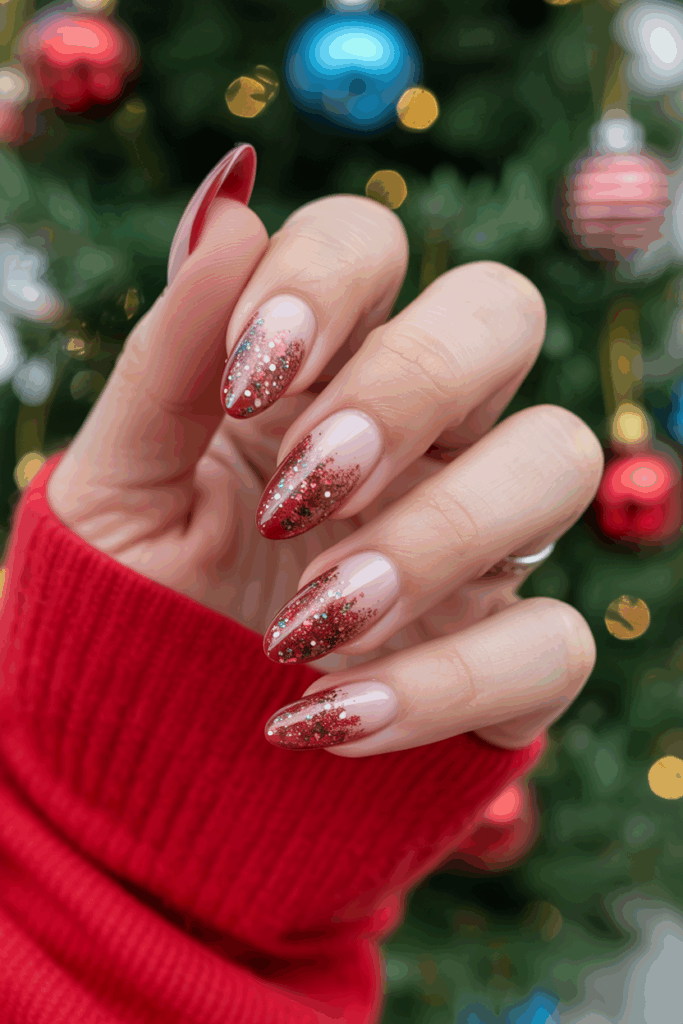 The glitter gradient on almond-shaped nails blends sparkles from the base to the tip. This creates a smooth and elegant look that adds subtle shine.