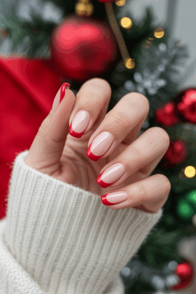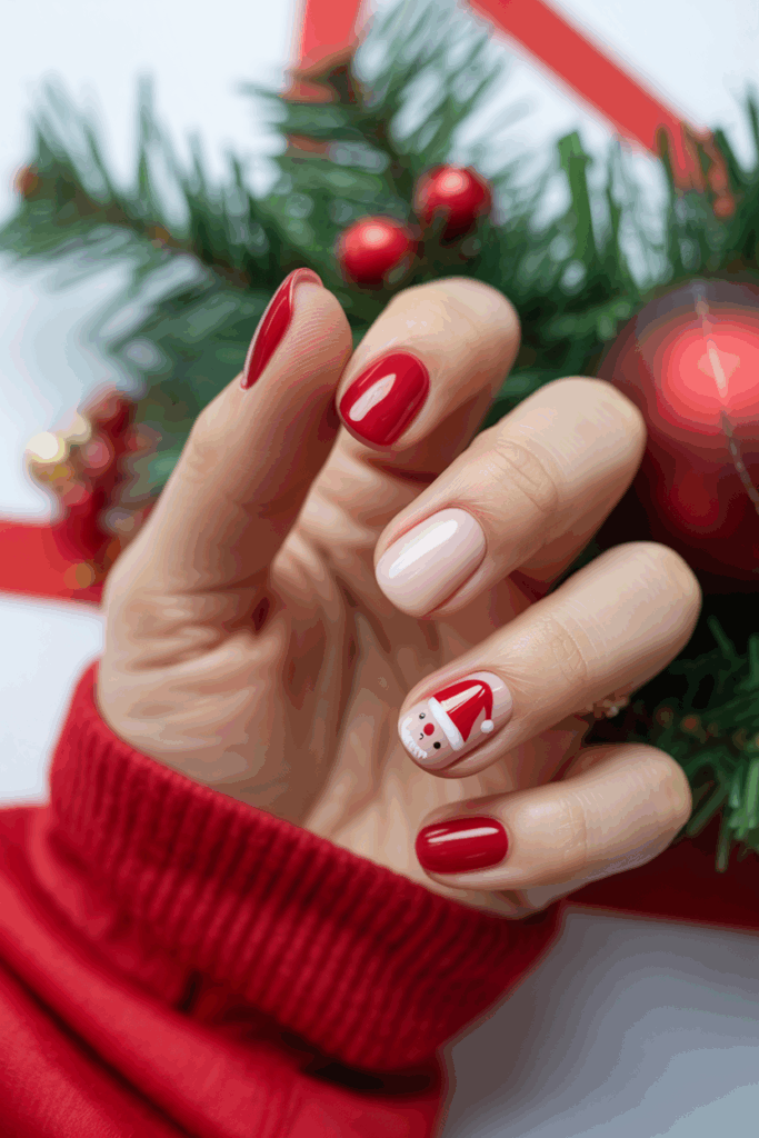 The festive Santa hat nail design is simple and classic. It usually features red tips with white trim, mimicking Santa’s hat. This design fits well on any nail length and works for both subtle and bold holiday looks. It is a popular choice for December nails.