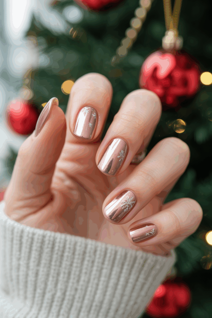 Metallic rose gold highlights add a soft shimmer to December nails. They create a subtle yet elegant shine that works well with neutral or dark winter colors. This look fits both casual and formal occasions during the holiday season.