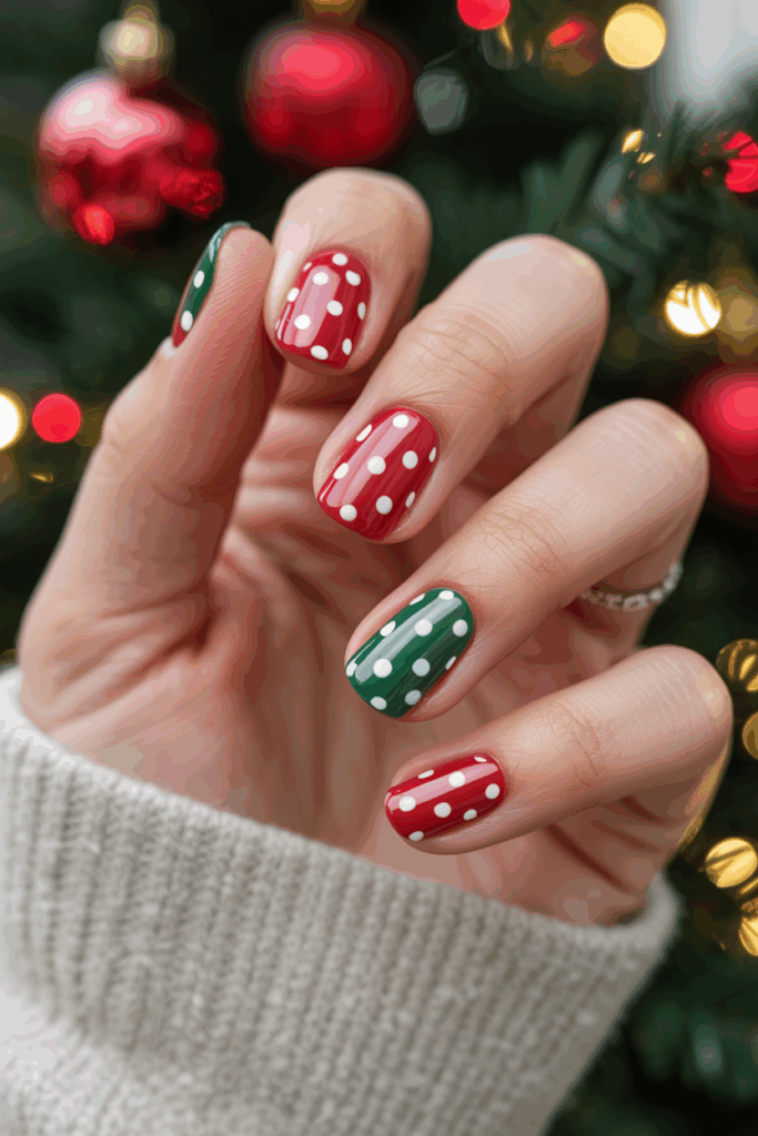 This nail design combines red and green polka dots for a simple festive look. It often features a solid base color with dots in the contrasting color. The pattern is playful and fits well with the holiday season without being too bold.