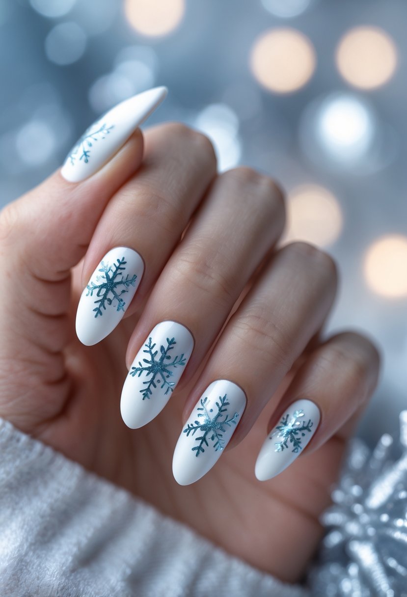 Snowflake designs on a matte white base create a clean, elegant look. The matte finish softens the brightness, making the snowflakes stand out clearly. This style suits those who want a simple yet festive winter manicure. It pairs well with both casual and formal winter outfits.