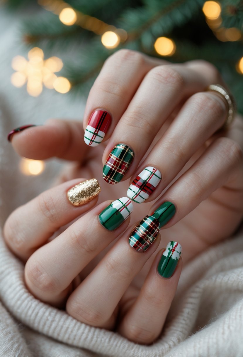 This design combines plaid and argyle patterns for a classic winter look. The mix adds variety while keeping the nails stylish and festive. Colors like red, green, white, and teal often work well with these patterns. It suits those who want a cozy but polished manicure for December.