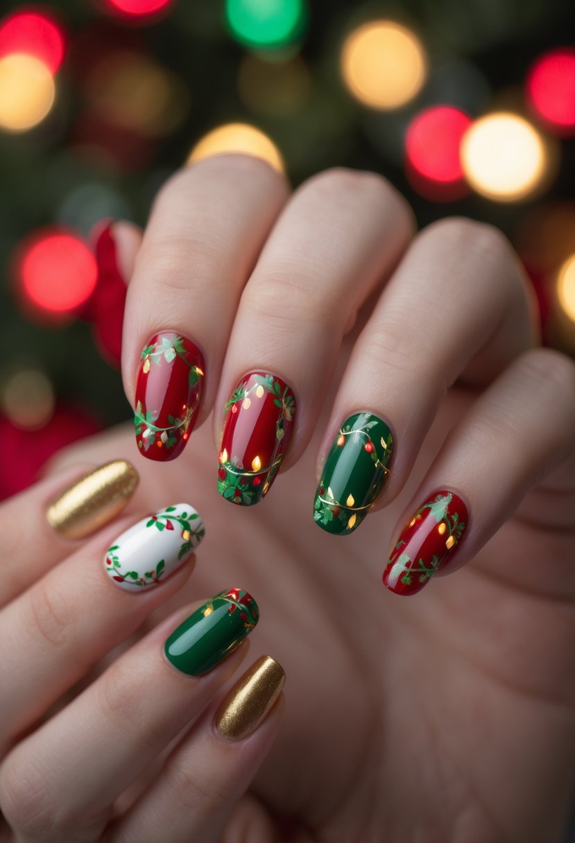 This nail art uses small, colorful lights to create a festive look. It often includes string light patterns on a neutral or dark base. The designs can be simple stickers or detailed hand-painted nails, perfect for adding subtle holiday cheer.