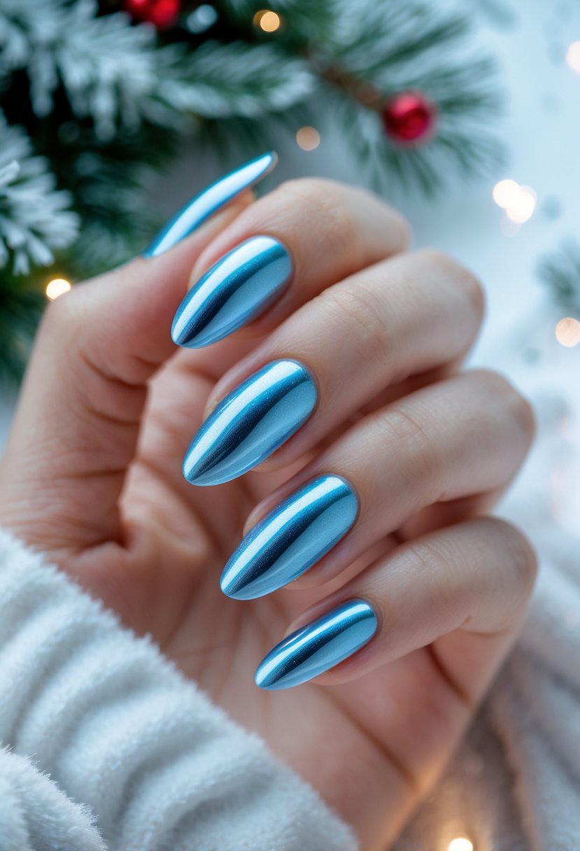 Ice blue nails with a chrome finish offer a sleek, modern look. The metallic shine reflects light, giving nails a glassy, icy effect. This style fits well with winter themes and looks clean and elegant. It works on both short and long nails.