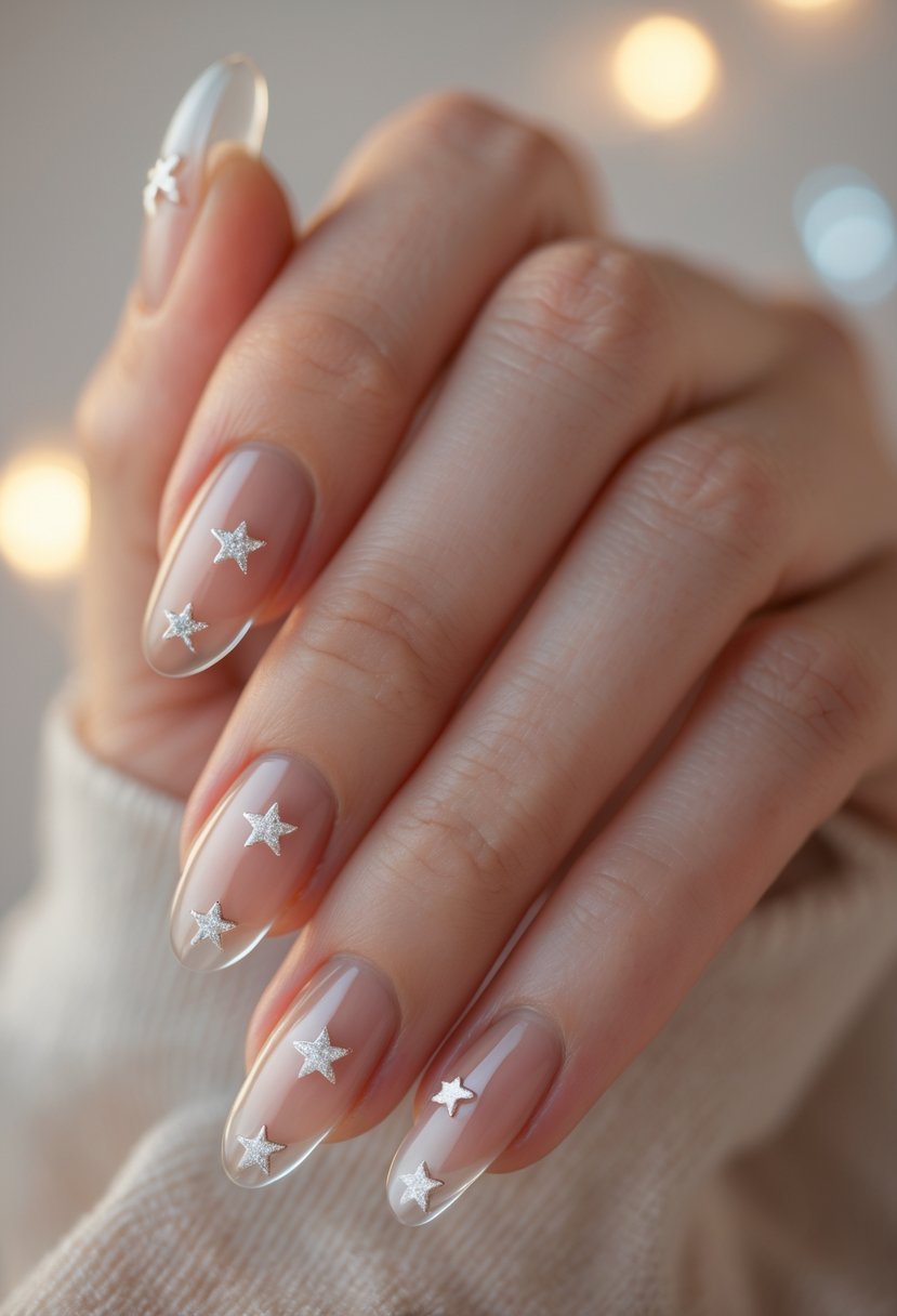 This design features small silver stars placed on clear nails. It offers a clean, simple look that works well for December.