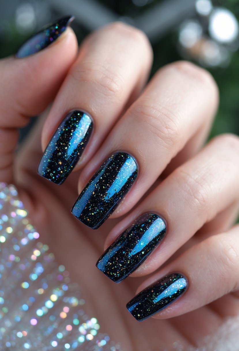 They apply holographic glitter polish over a dark nail color to create contrast. The dark base makes the glitter stand out more clearly. This look works well for both short and long nails and adds a subtle shine without being too bright.