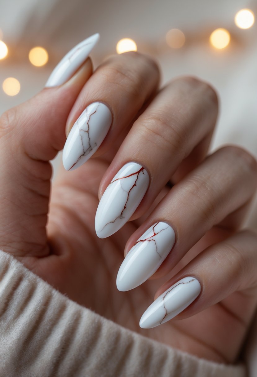 Marble nails with red veins add a unique twist to classic holiday styles. The swirling red patterns create a natural stone effect that looks both bold and elegant. It works well on short or long nails, making it a versatile choice for December.