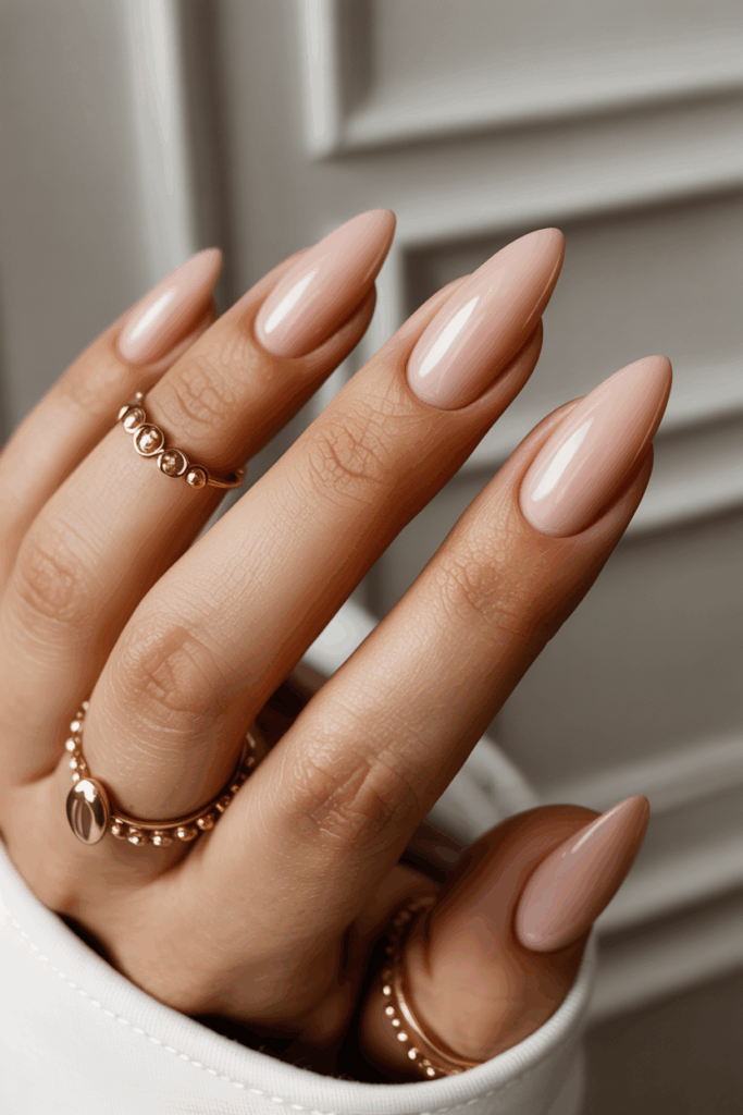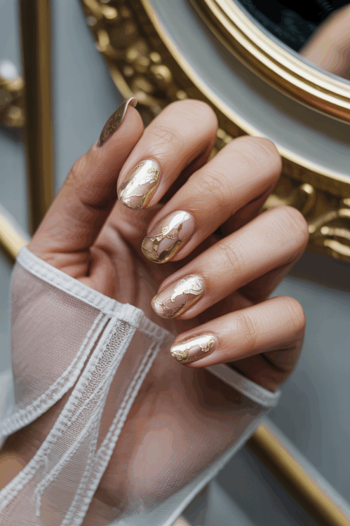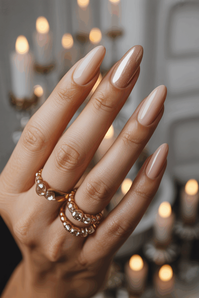 This nail design blends soft nude tones with a gentle champagne shimmer. It offers a subtle shine that suits many skin tones.