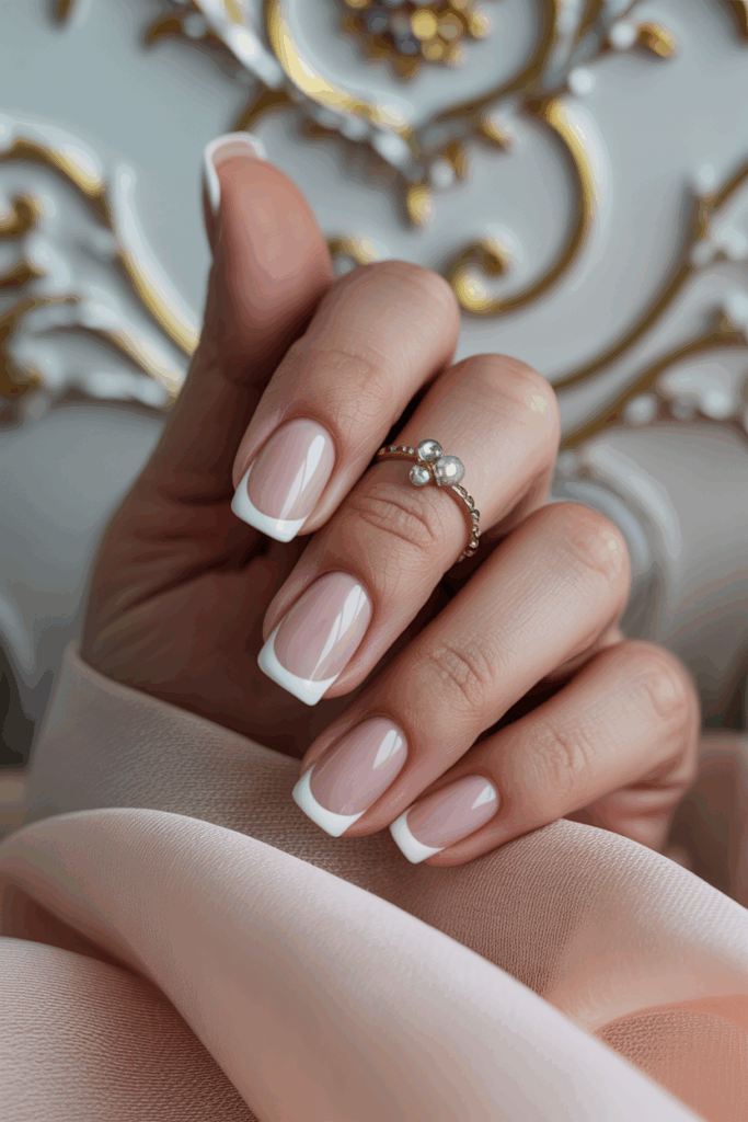 The pearls catch the light gently, giving nails a slight shine without being too bold. It is a simple way to elevate the traditional French tip.