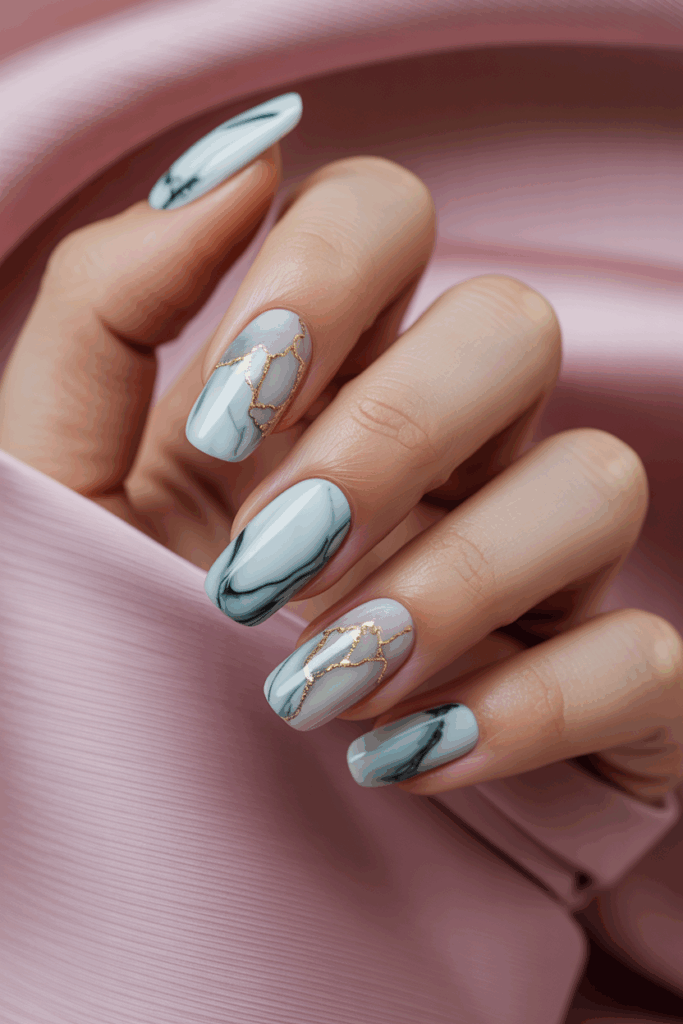 The marble effect can be done with gel or acrylic polish. It suits all nail shapes and lengths, making it versatile and stylish.