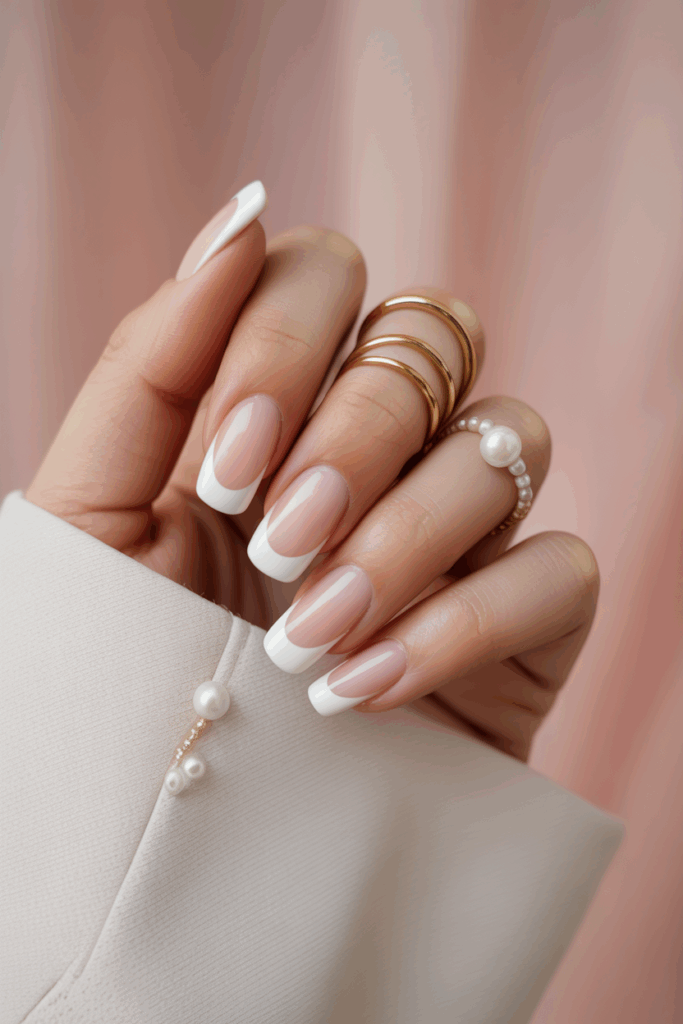 Pearl white French tips add a subtle touch of elegance to a classic manicure. The soft white tips combined with delicate pearl accents create a refined and polished look.