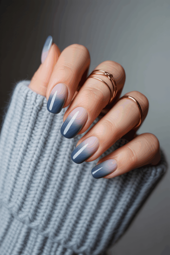 The smokey grey gradient is a soft blend of tones that fades from dark to light. It creates a smooth, elegant look on the nails.