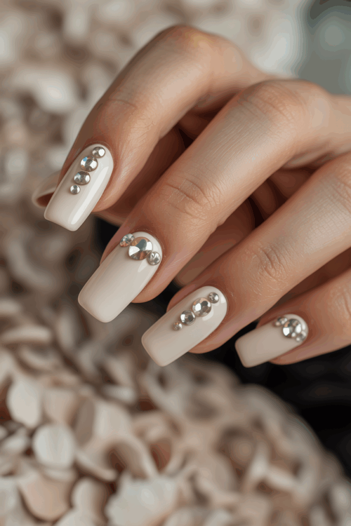 Soft beige nails offer a clean, elegant look that works well for many occasions. Adding rhinestones creates a subtle shine without being too flashy.