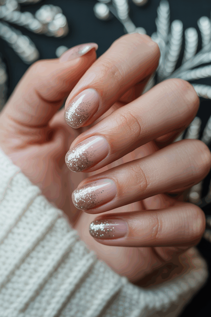 This nail design blends a soft gradient with a touch of glitter for a refined look. The sparkle starts light at the base, growing more intense toward the tips.