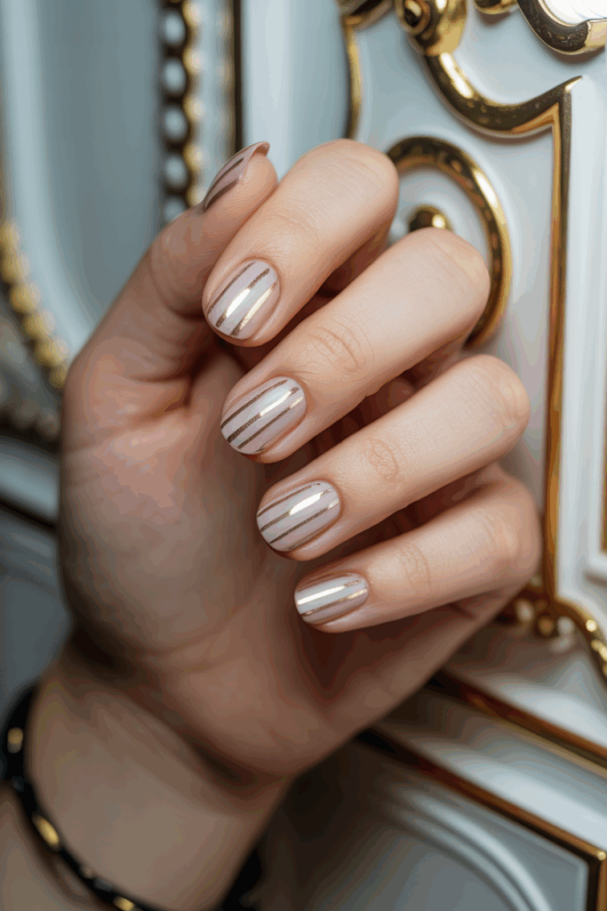 Thin metallic stripes add a simple yet polished touch to any nail design. They work well on neutral or soft bases, giving nails a subtle shine without being too bold.