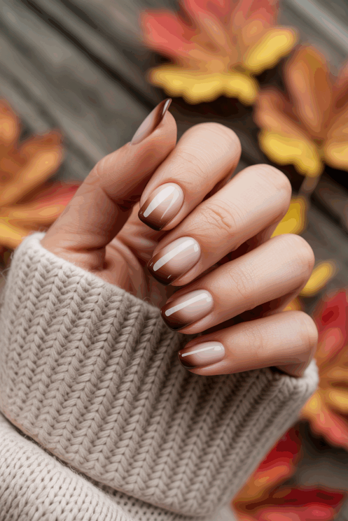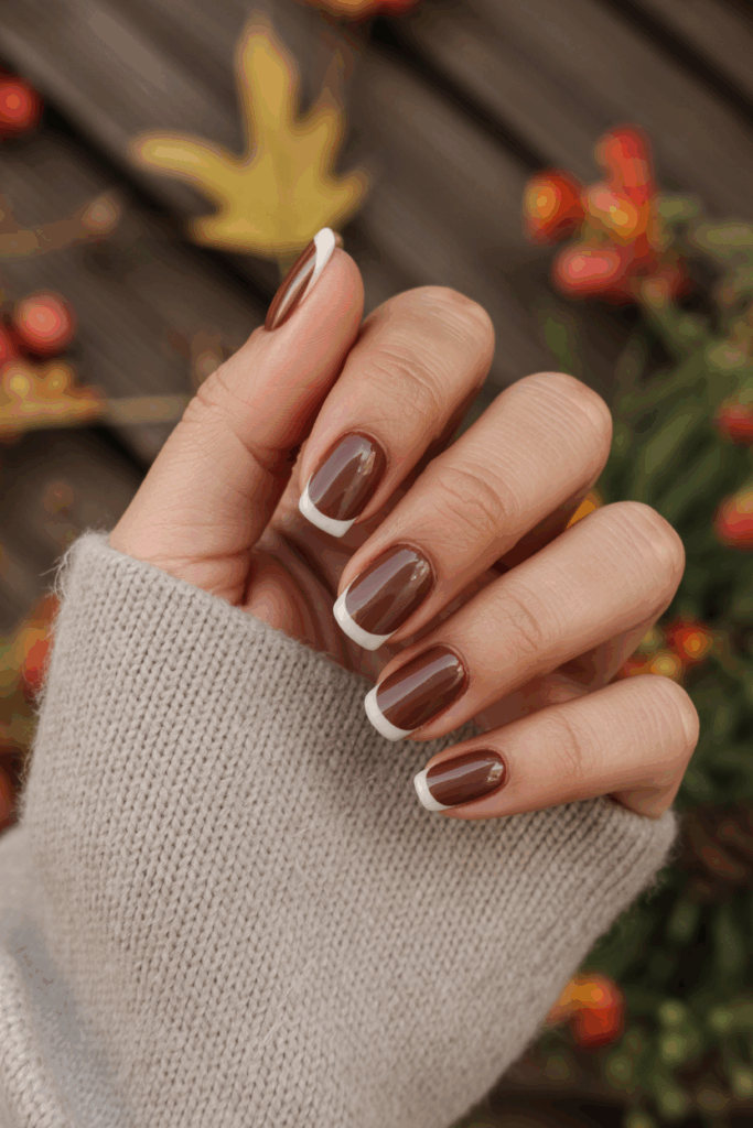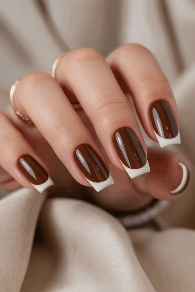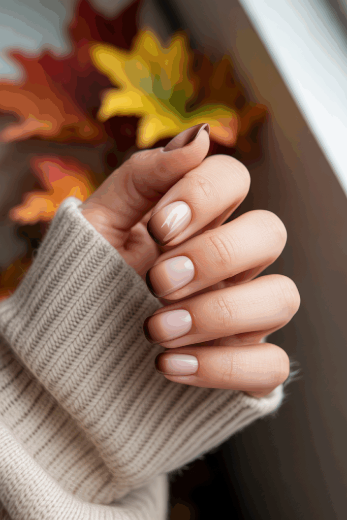 This one is so simple but so good. It’s just your usual French tips, but instead of the sheer pink base we’ve all had since high school, you use a cozy chocolate-brown or caramel shade underneath. It instantly feels like fall — like denim jackets, apple picking, and walking outside when the air finally smells cold.