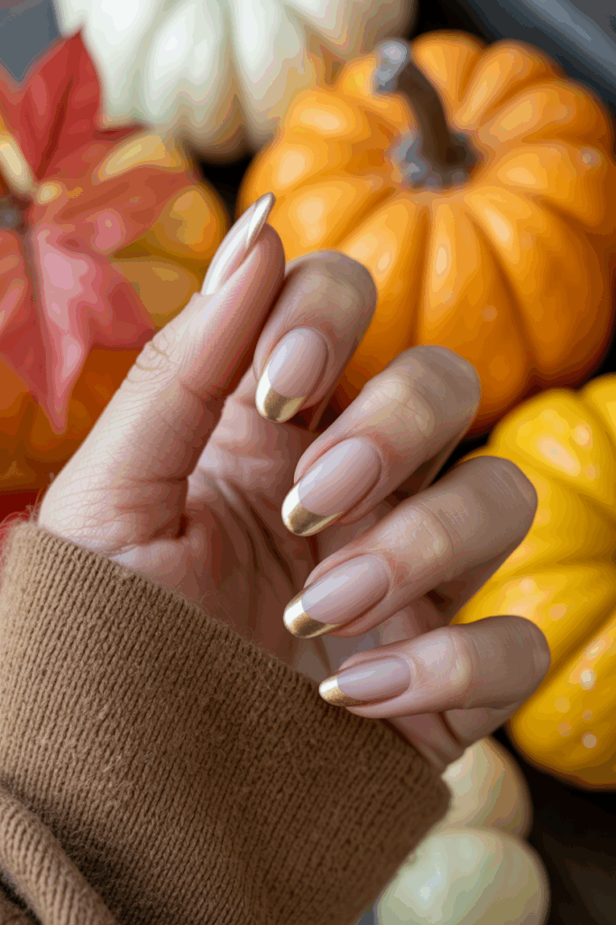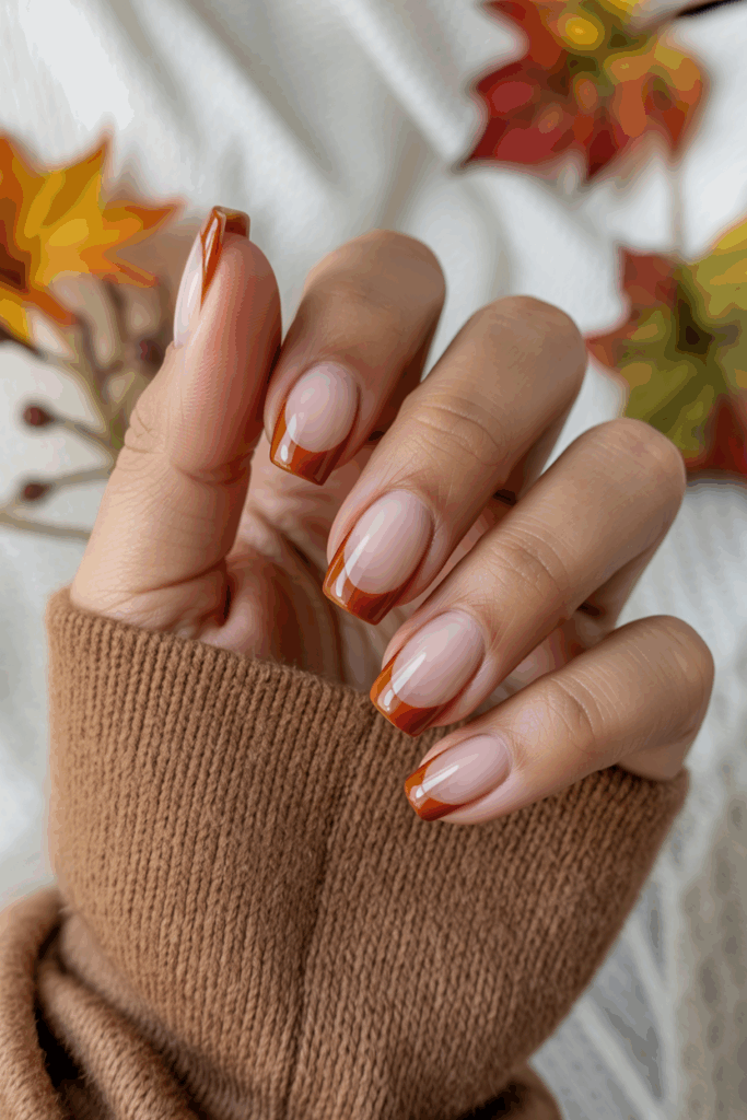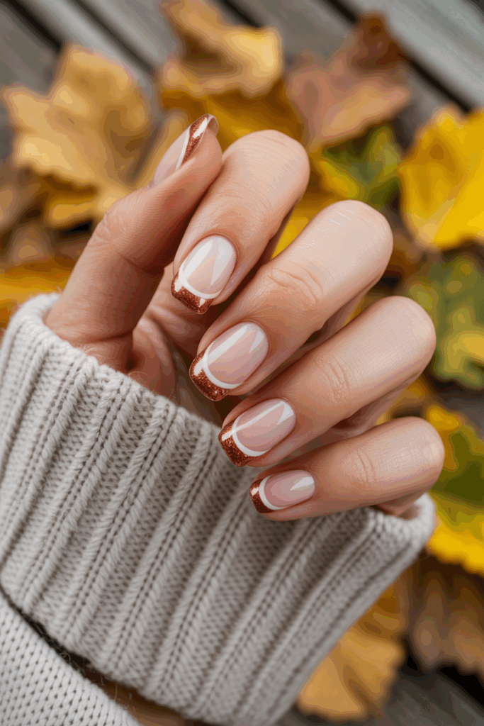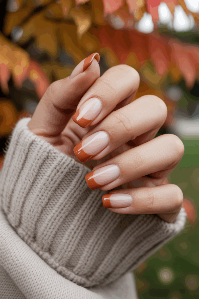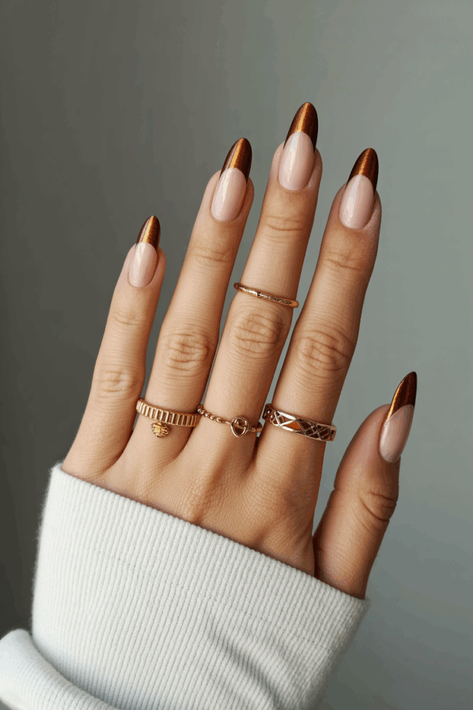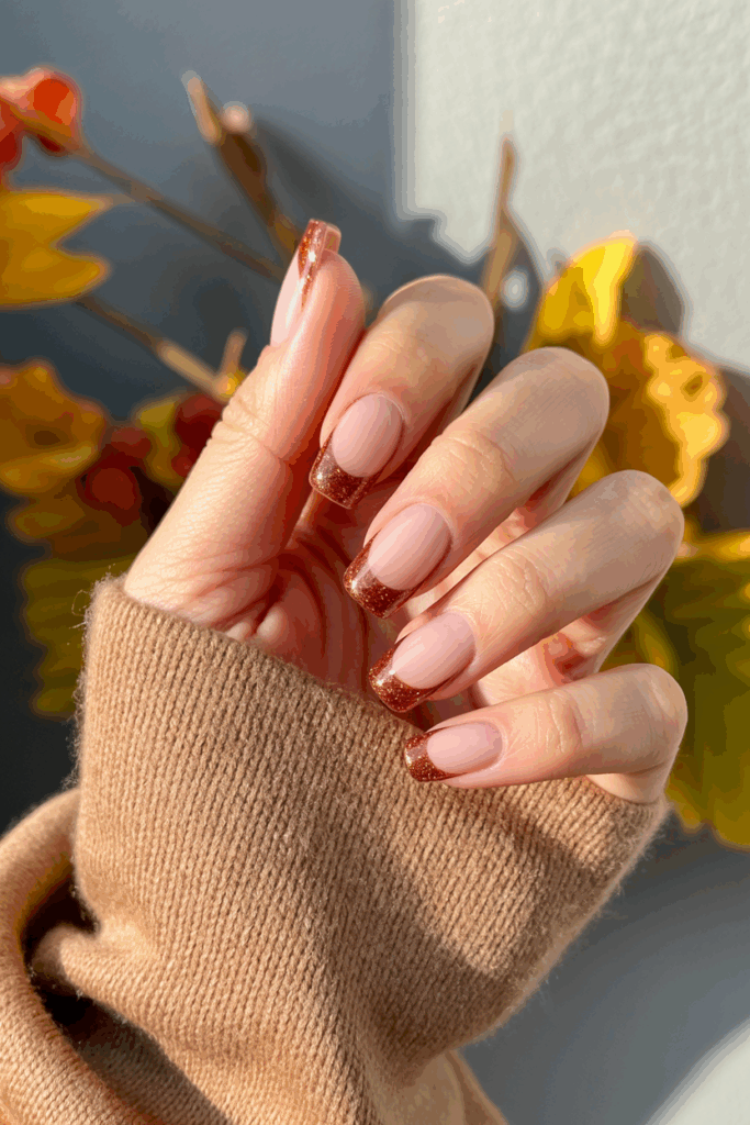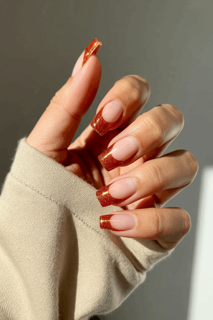 This one is like a tiny hint of autumn sunlight at the edge of your nails. Not full glitter. Not sparkly overload. Just a soft copper shimmer right at the tips. It catches light when you move your hands, especially if you’re holding a mug, and it feels really warm and seasonal.