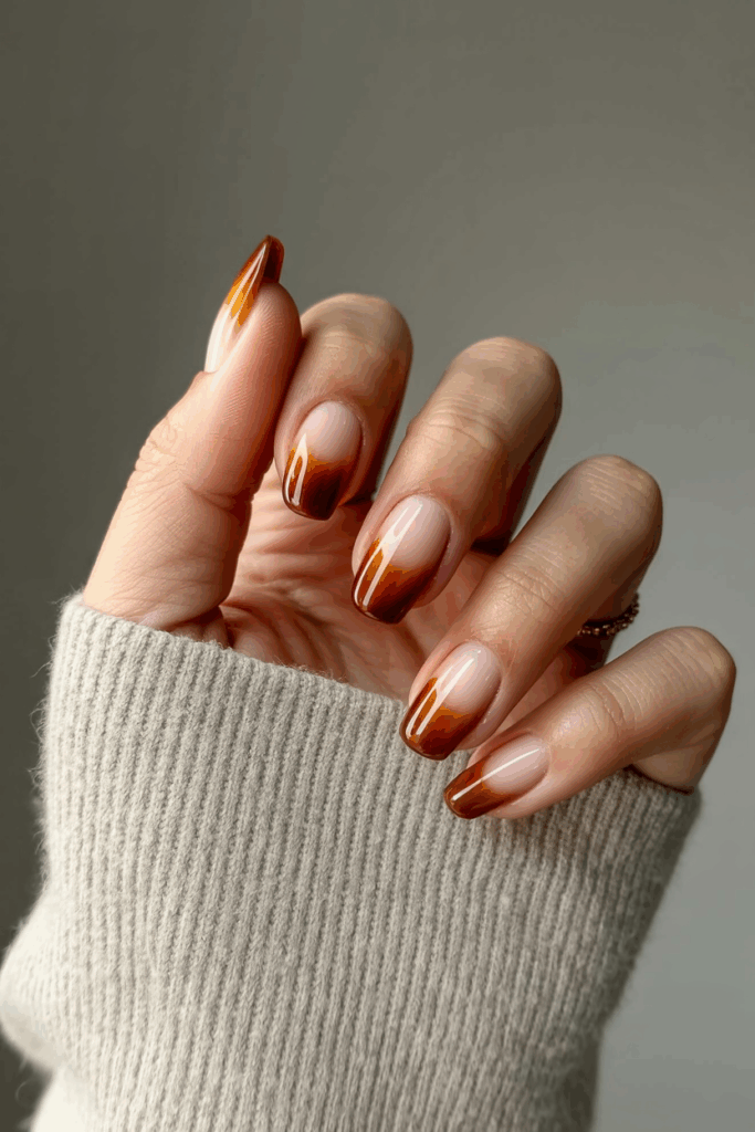 For those who want a little more glam, adding a shimmer top coat or pairing caramel ombre tips with gold jewelry enhances the richness of the shades. This look effortlessly transitions from casual daytime wear to evening elegance, making it a true staple for fall.