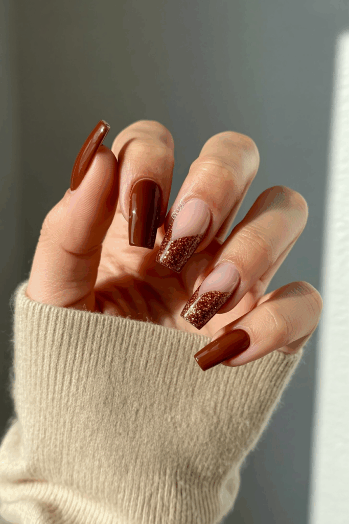 Pairing this manicure with warm-toned accessories or cozy knitwear creates a cohesive seasonal aesthetic. Cinnamon brown glitter tips embody the comfort and joy of autumn perfectly.