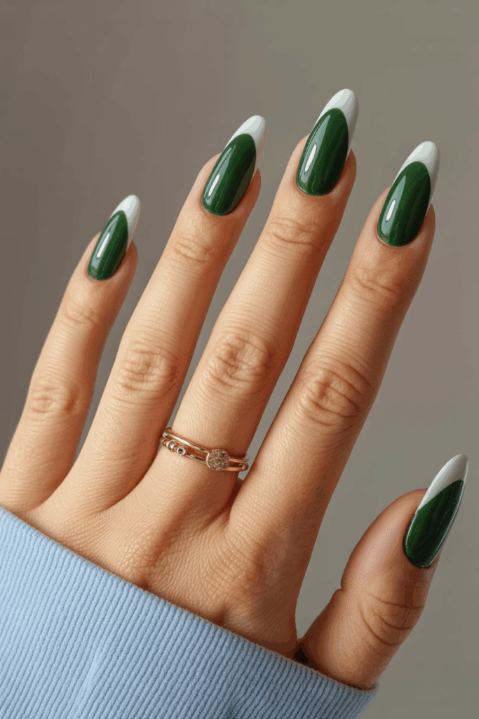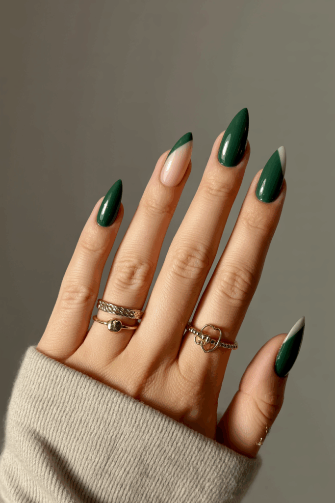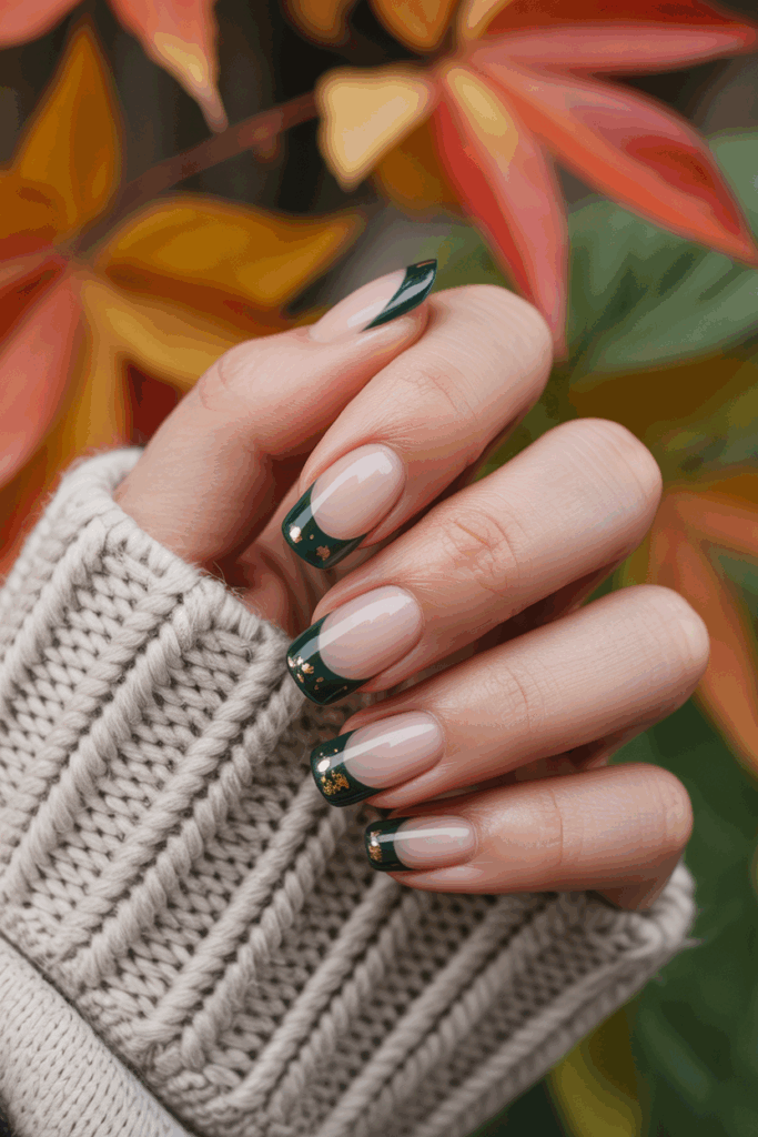 Dark green always feels like fall forests and evening walks, so using it just on the tips gives the manicure a cozy, seasonal vibe without going full dark polish. The tiny gold flecks look like they just happened to land there — they sparkle a little in sunlight, a little in lamplight, but they never look glittery or loud.