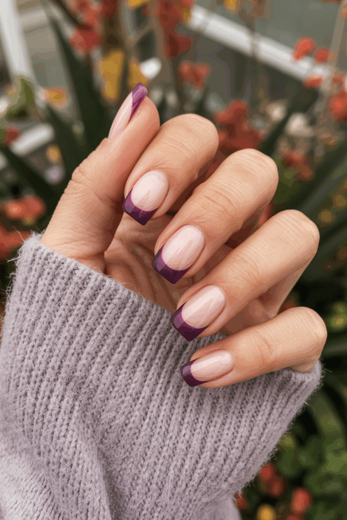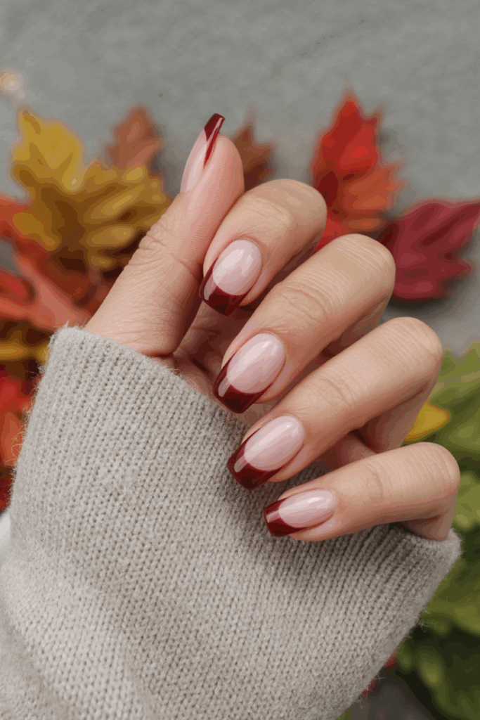 Rich wine-red tips capture the essence of autumn evenings and cozy celebrations. This manicure echoes the color of seasonal wines, bringing romance and elegance to your nails. It’s bold without being overwhelming, offering a sophisticated update to the traditional French design.
