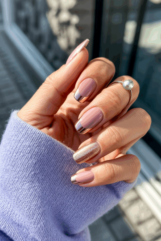 This manicure is ideal for those who want something understated yet eye-catching. Mauve is subtle enough to blend with neutral wardrobes, while rose gold adds a sophisticated glow. It’s the kind of design that works equally well at a fall wedding or a cozy coffee date.
