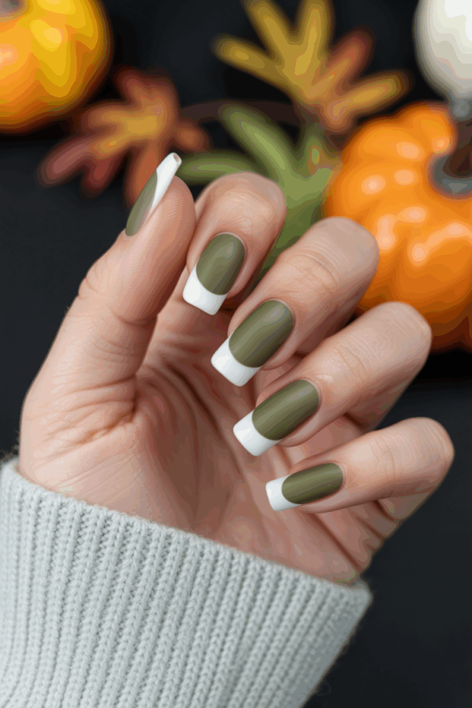 Forest green angled French tips give the classic look a geometric, modern update. Instead of the traditional curved line, the tips are applied at a diagonal angle, creating a sleek, edgy finish. The deep green color ties directly into fall foliage and natural autumn tones.