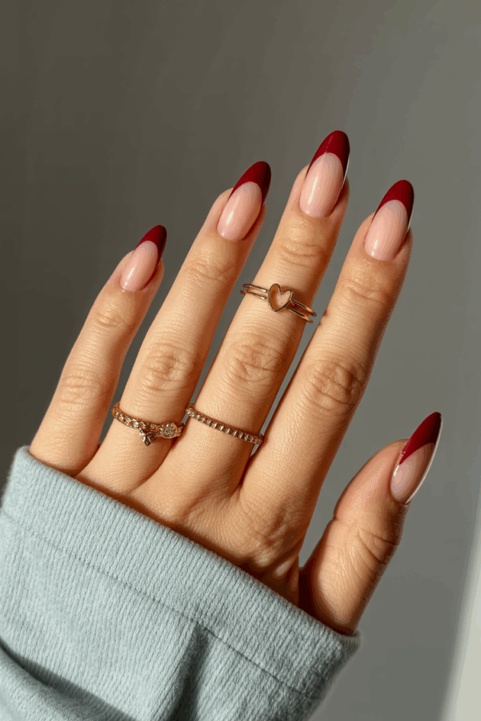 Burgundy just belongs to autumn — like candles and cinnamon and that first night you realize you need a blanket. Doing your French tips in a deep wine shade instantly makes your nails look rich and slightly moody, but in a really chic way.