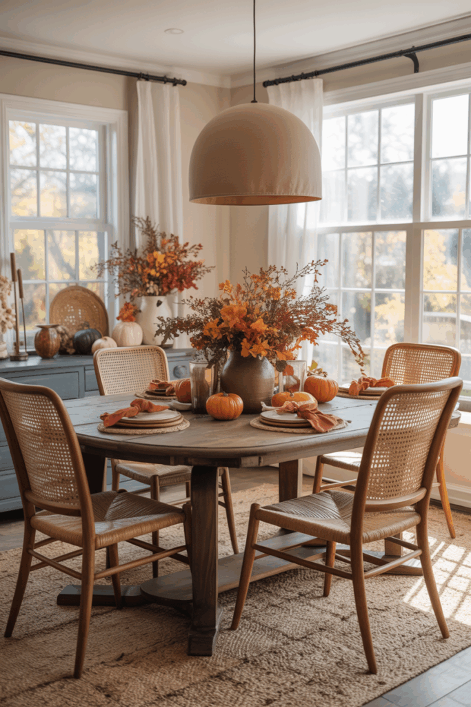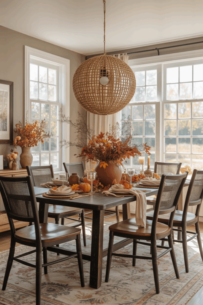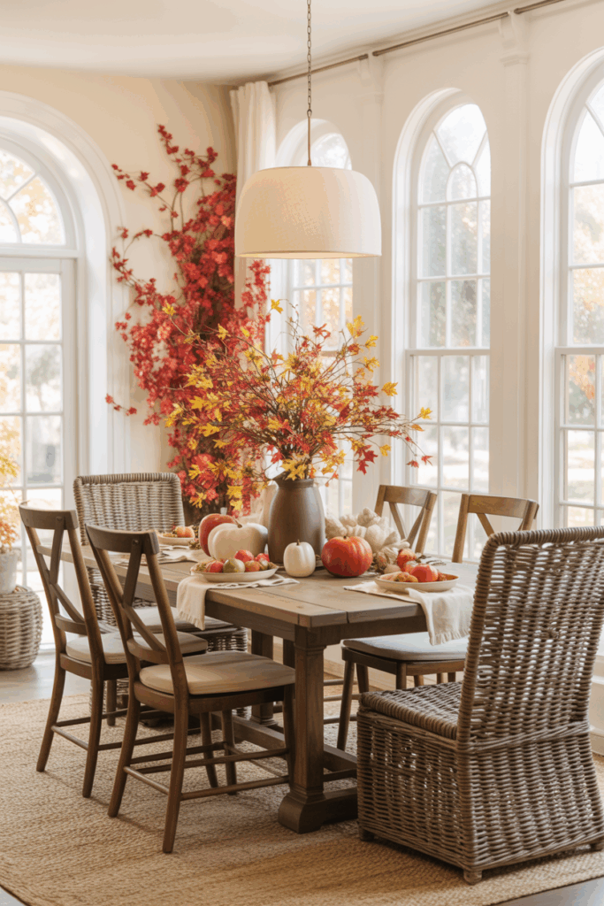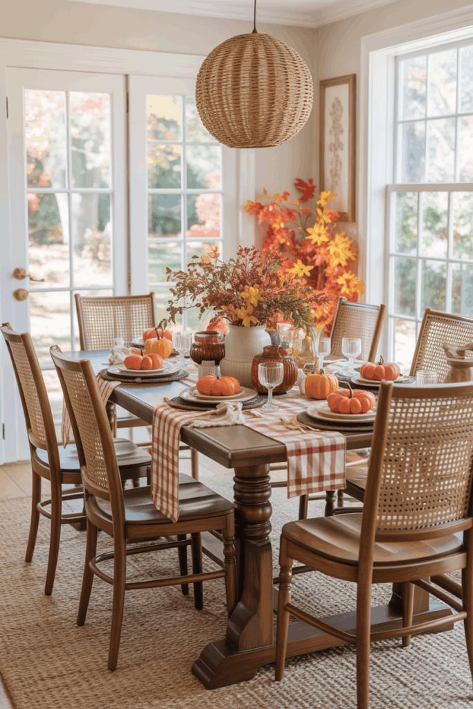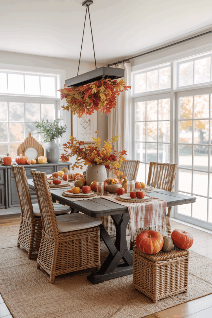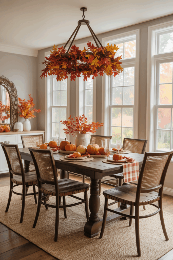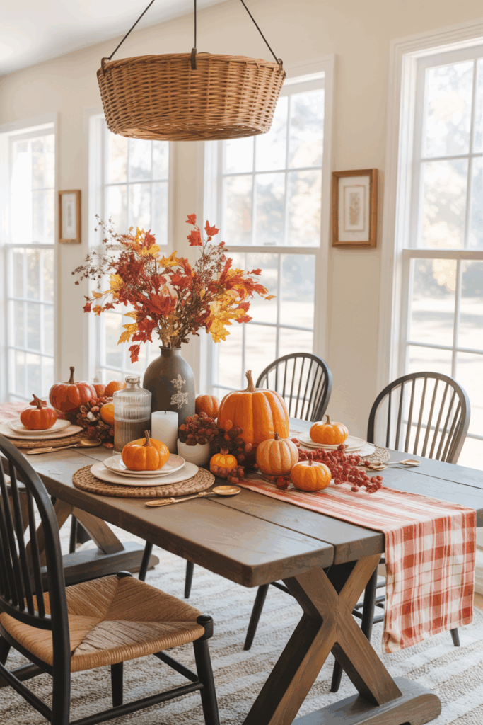 A table runner with fall motifs adds a simple seasonal touch to any dining room. It can feature colors like orange, brown, and gold or patterns like leaves and pumpkins. This small change helps bring warmth and a cozy feel to mealtime.