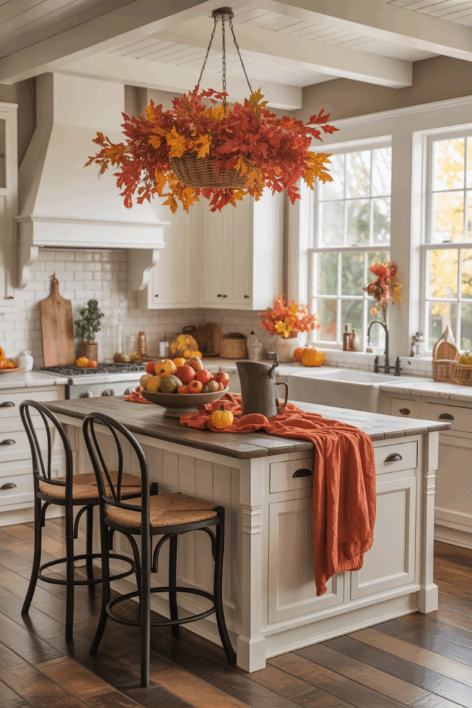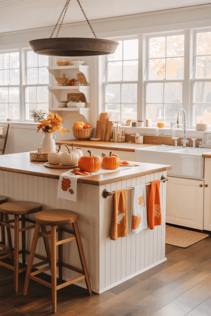Small swaps in the kitchen make a big seasonal difference. Hanging towels with autumn colors or leaf motifs instantly refreshes the space without needing a full redesign.