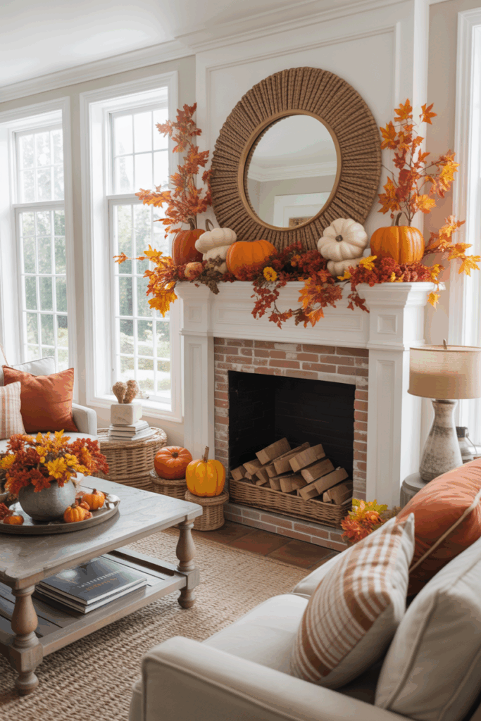 Layering mirrors on a mantel creates depth and makes rooms feel brighter, especially in shorter fall days. Adding seasonal accents around them ties the entire display together.