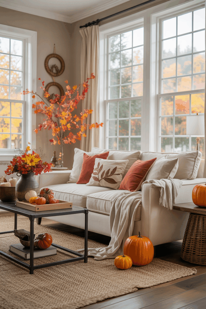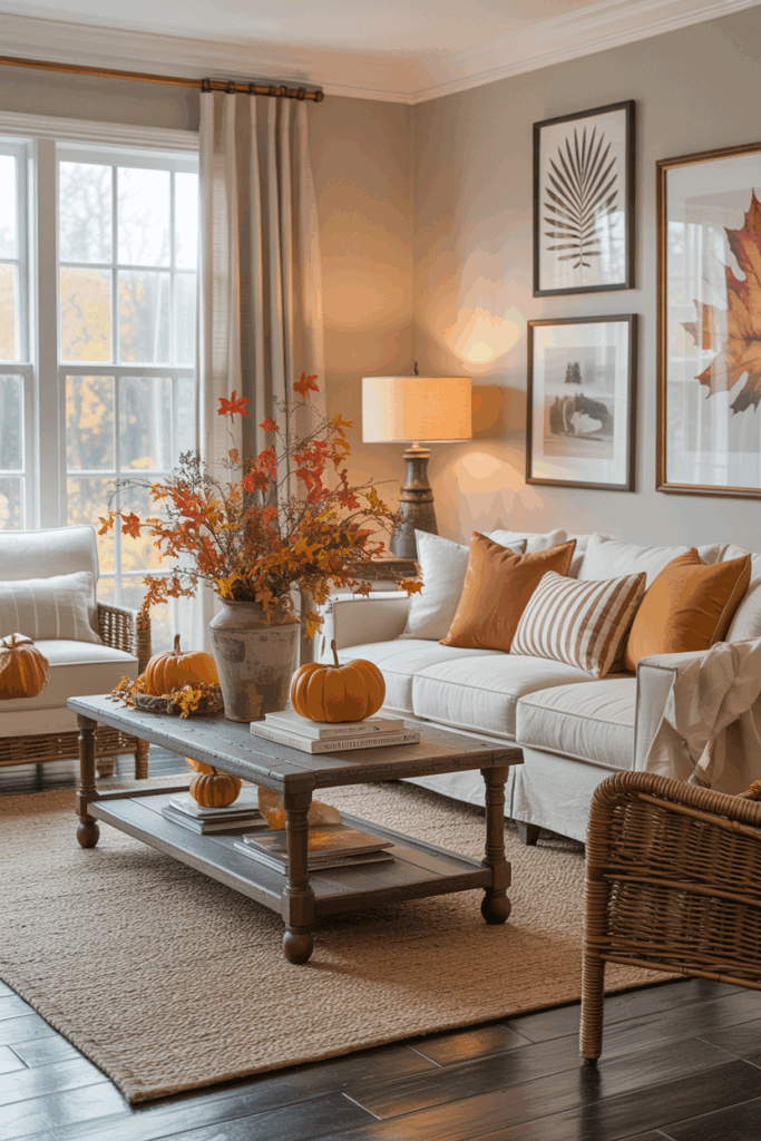They can drape chunky knit blankets in warm colors like burnt orange or deep gold over sofas. This adds texture and a soft touch to the living room. These blankets create a simple yet inviting look for fall.