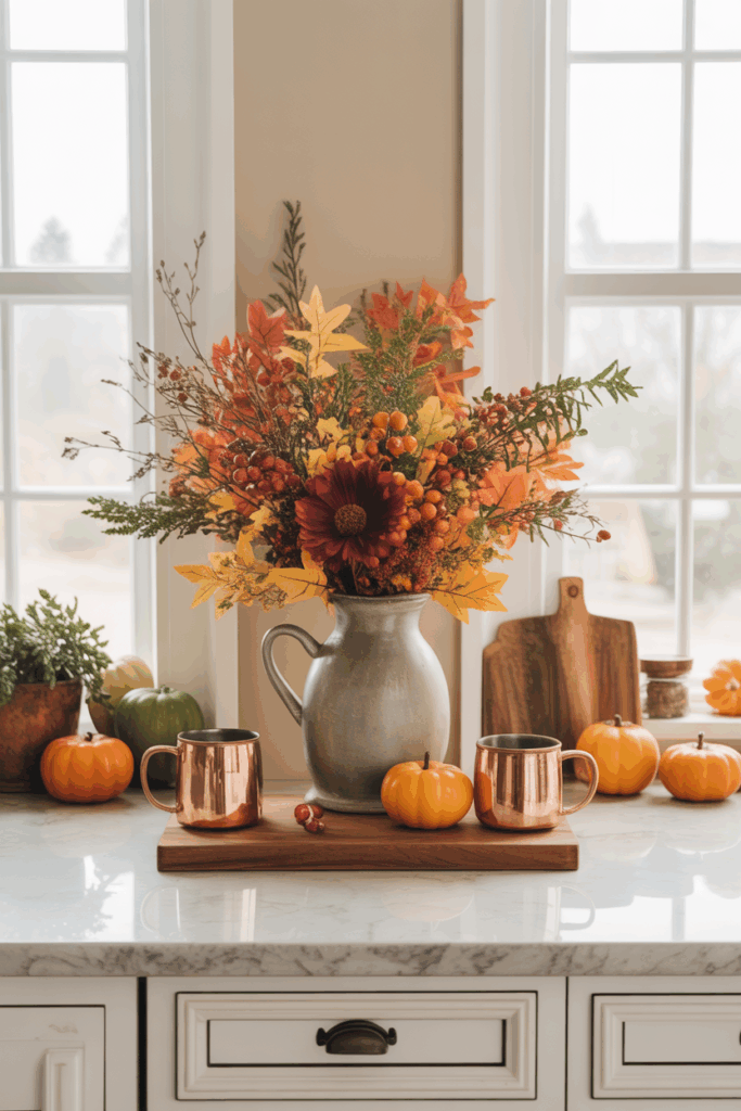 Copper mugs add a warm, natural touch to kitchen decor. They can be placed on open shelves or countertops where they are visible. This small detail helps bring a cozy, seasonal feel that works well in fall settings. Copper also pairs nicely with neutral and white kitchen styles.