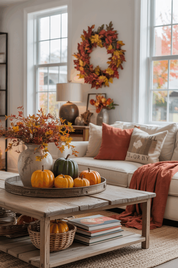 Place candles, pumpkins, and small plants on a wooden tray to instantly create a styled centerpiece. The tray keeps everything contained and makes the display look intentional.