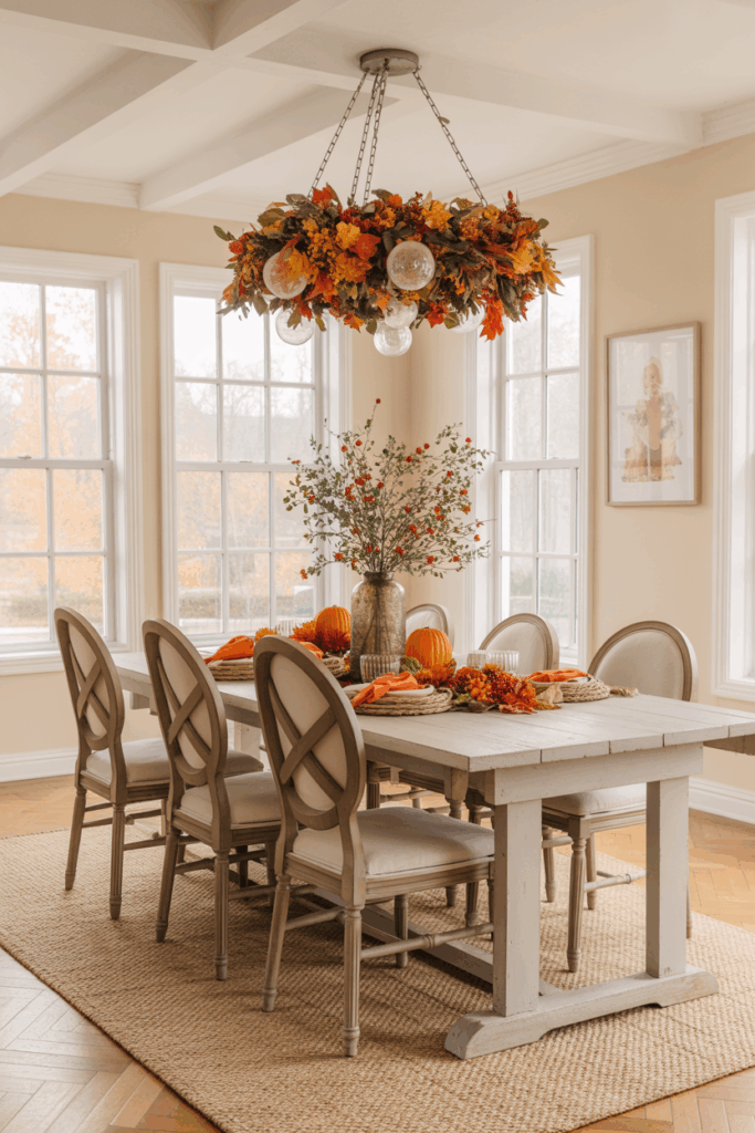 They can add warmth and charm to any room. Decorating a chandelier with fall garlands and simple ornaments like pinecones or leaves fits well with autumn themes. This small change helps tie the whole room’s look together for the season.