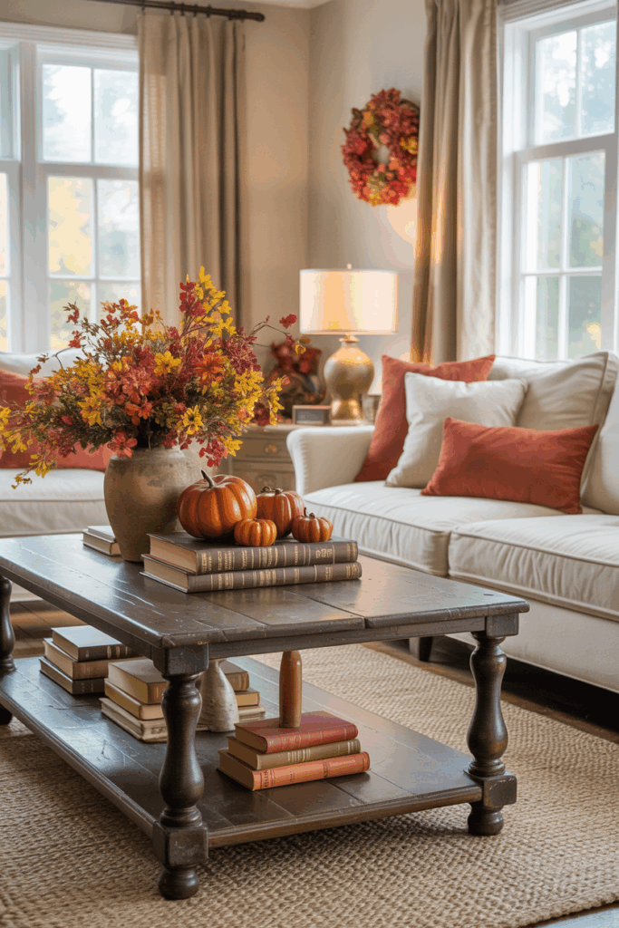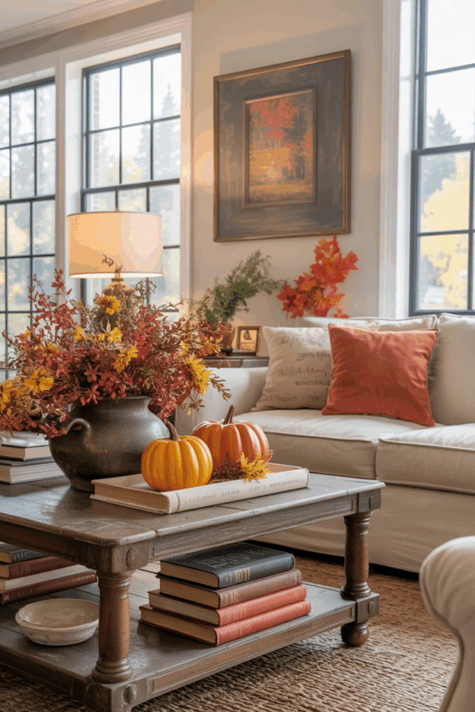 Stacking vintage books in colors like deep brown, maroon, and mustard creates instant fall character. These can be displayed on coffee tables, mantels, or bookshelves.