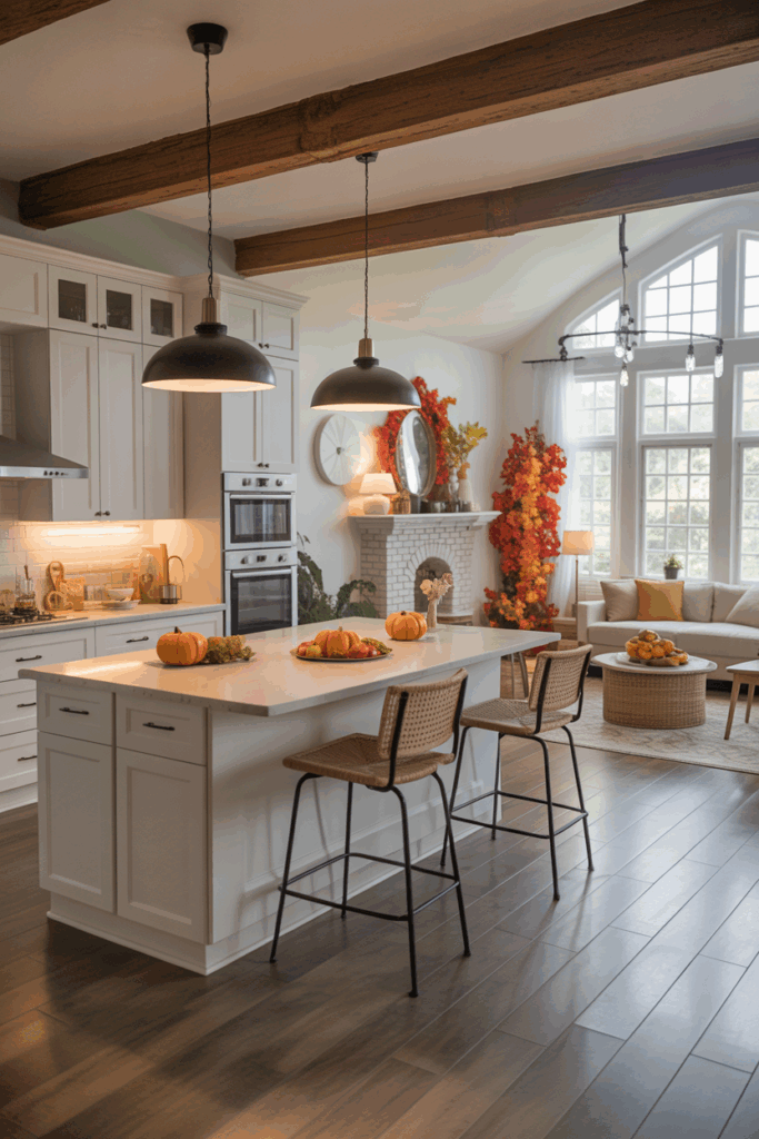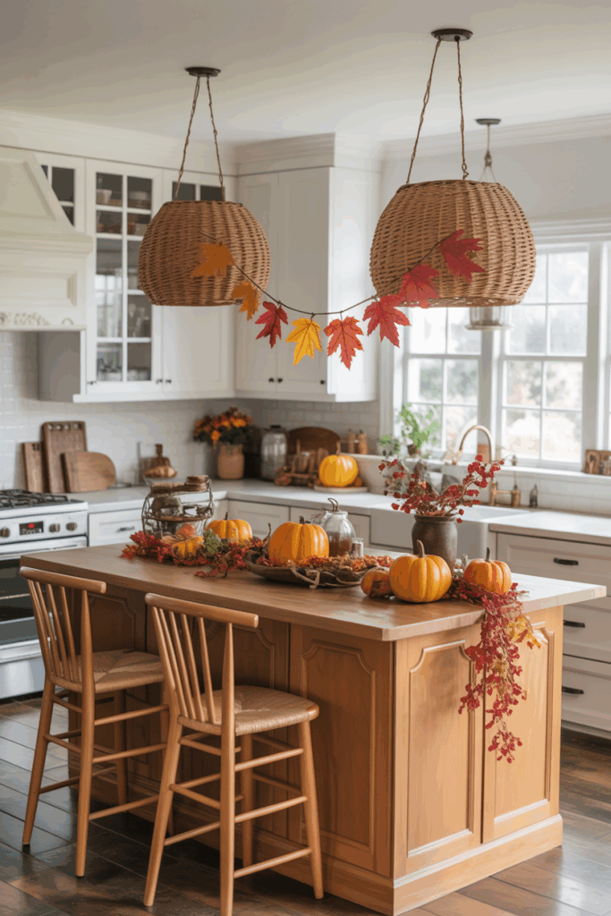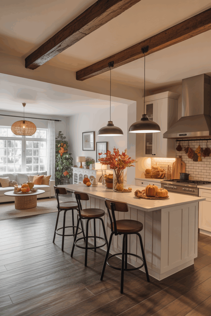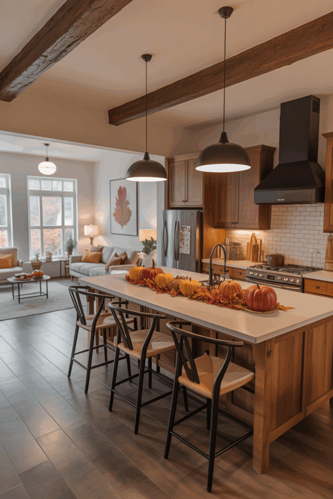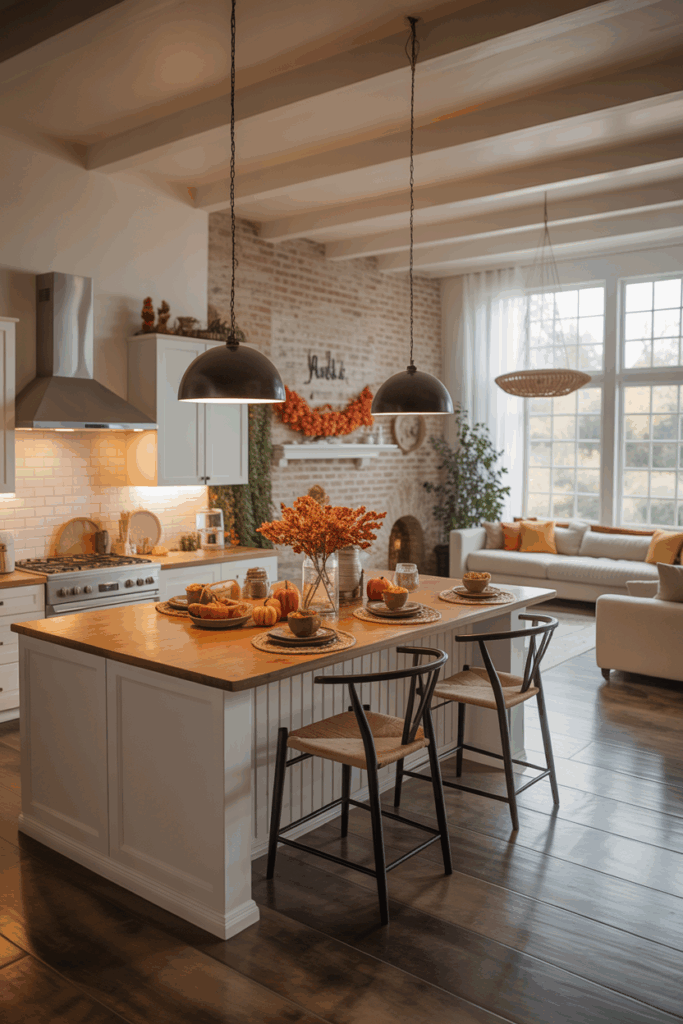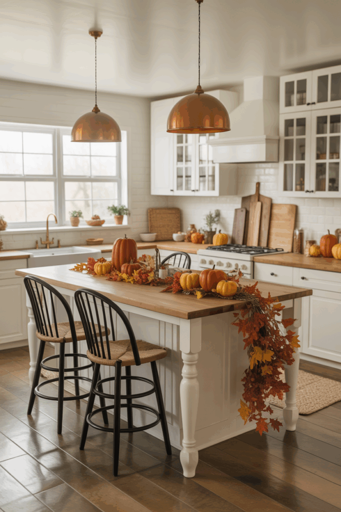 For a more dramatic effect, you can even temporarily switch out kitchen curtains, chair cushions, or bar stool covers to match your chosen fall colors. This extra step ties the whole space together and creates a true seasonal transformation without any permanent changes
