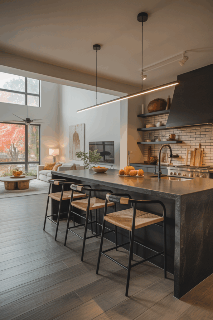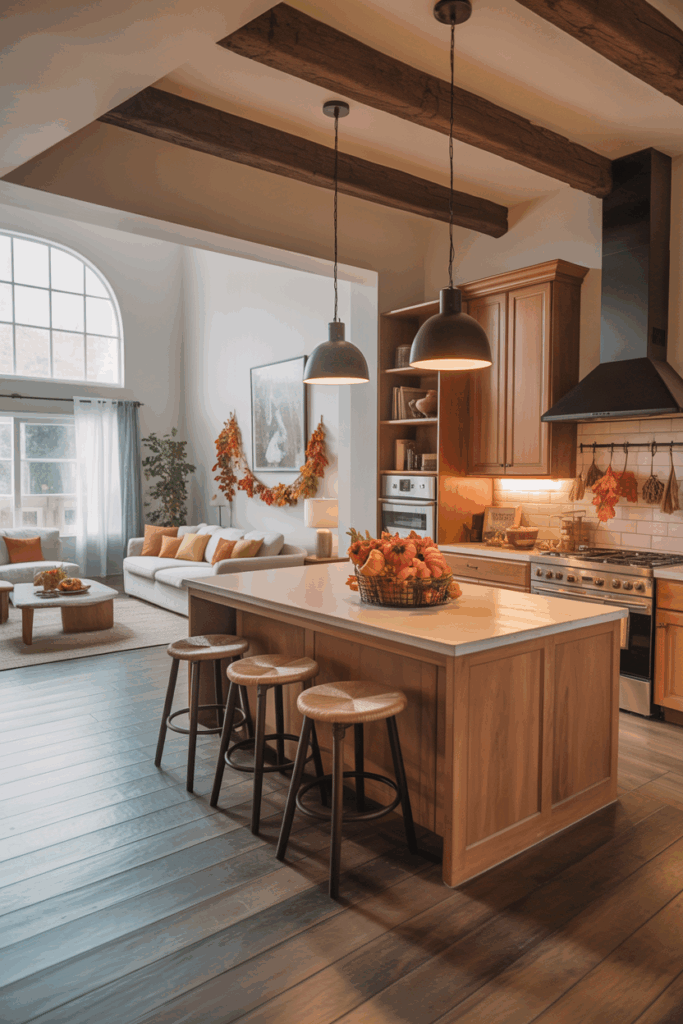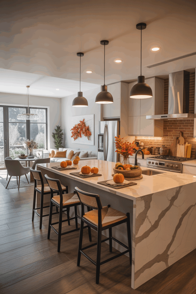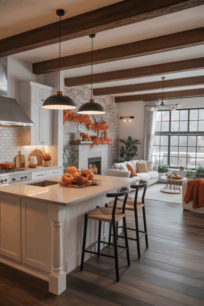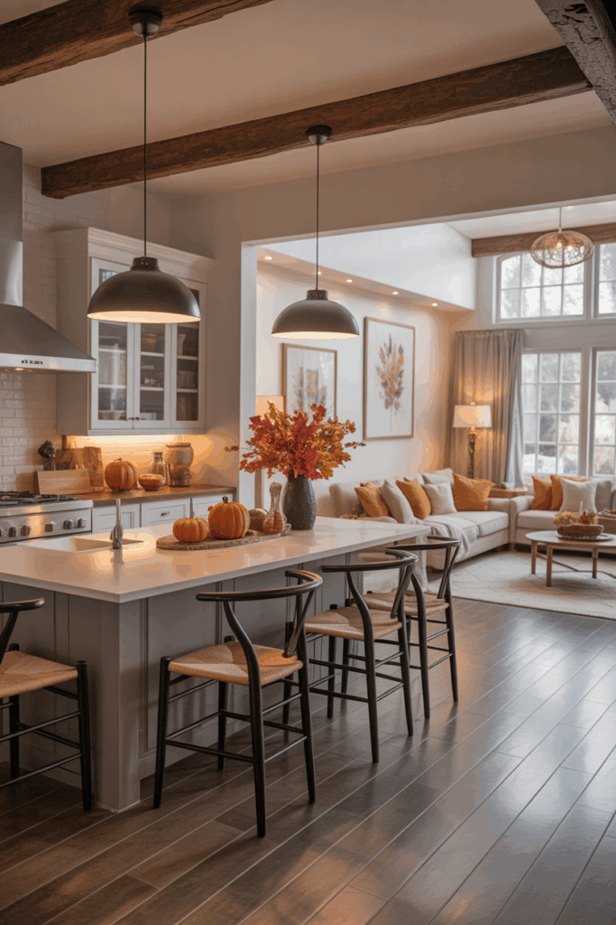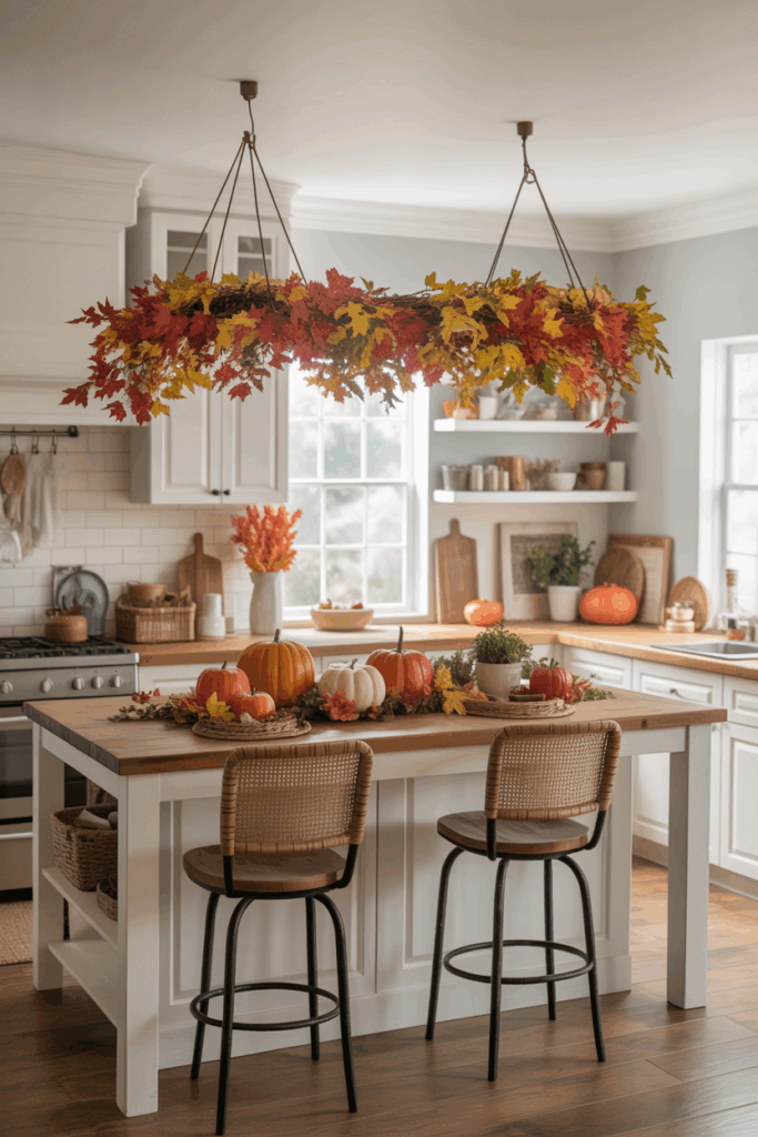 For a more dramatic effect, you can even temporarily switch out kitchen curtains, chair cushions, or bar stool covers to match your chosen fall colors. This extra step ties the whole space together and creates a true seasonal transformation without any permanent changes