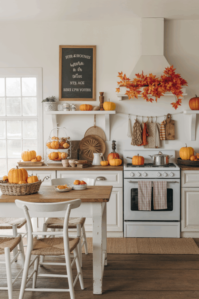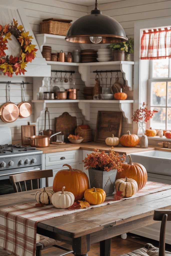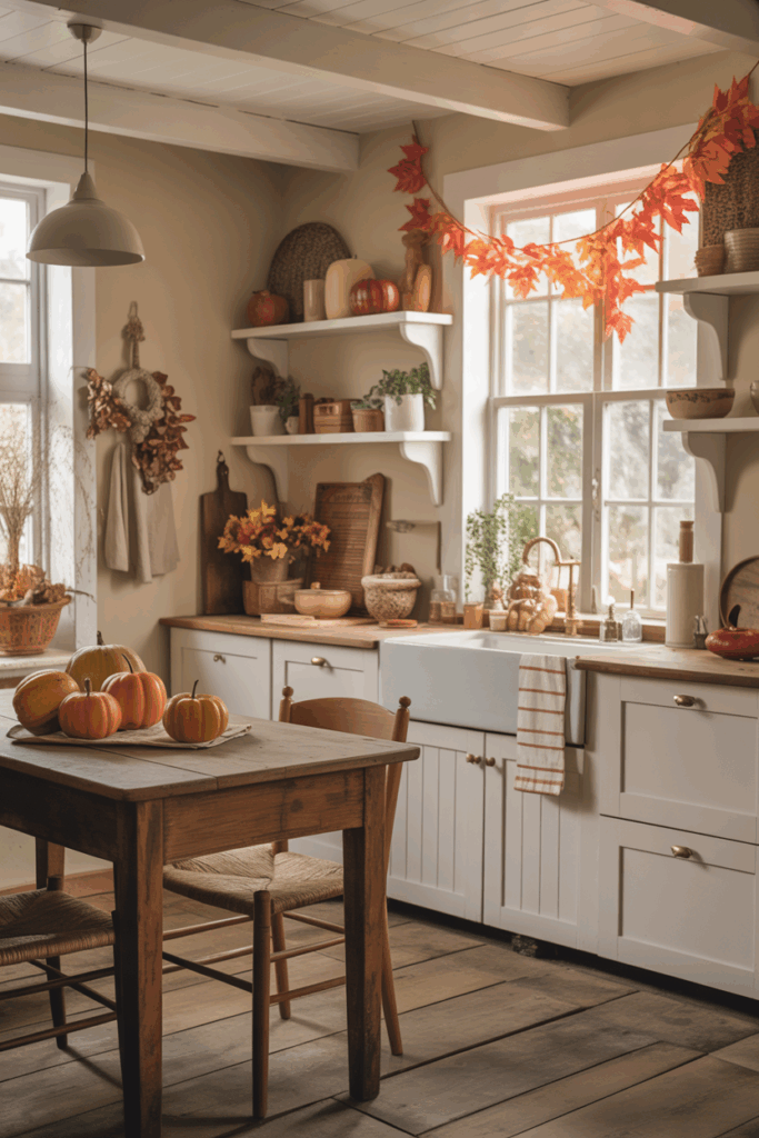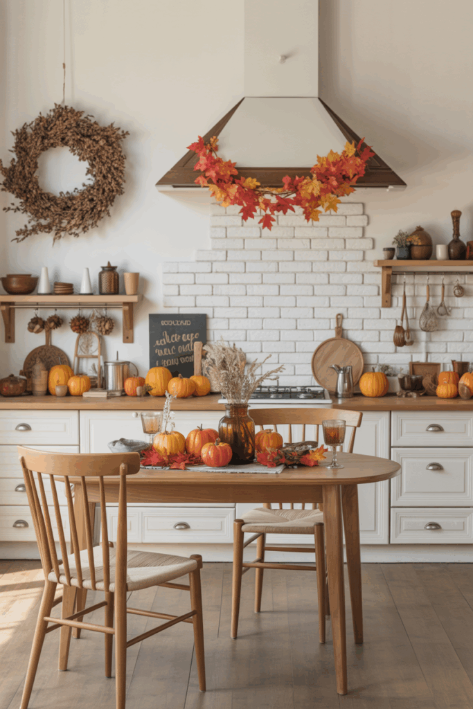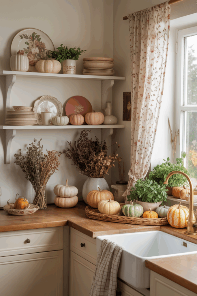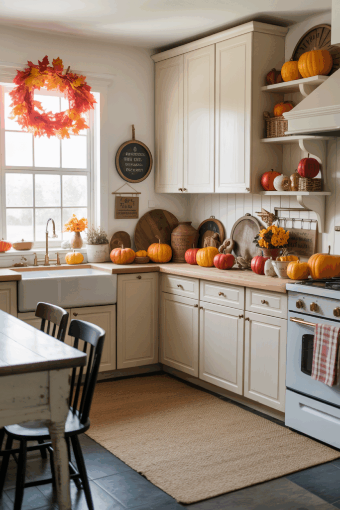 Decorate countertops, shelves, or window sills with small real or faux pumpkins. Mix different sizes, shapes, and colors for variety. Velvet, ceramic, wooden, and neutral-tone pumpkins are popular for modern fall kitchen decor.