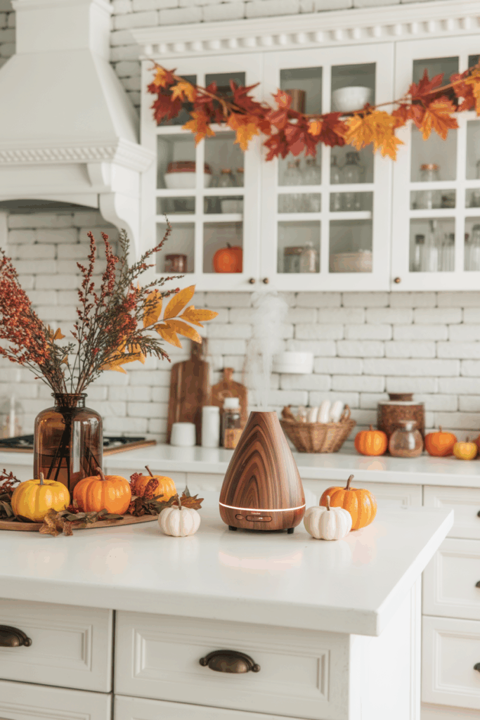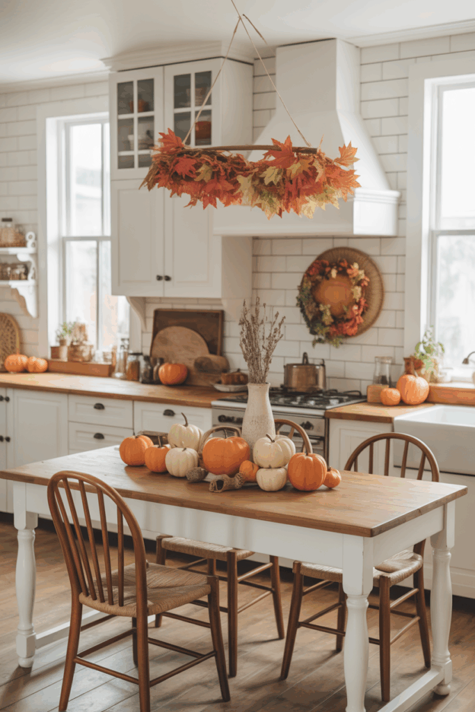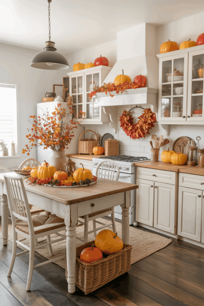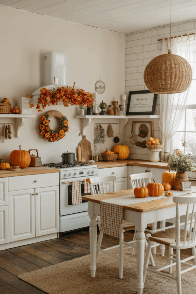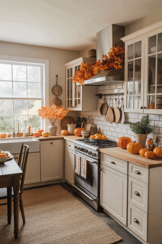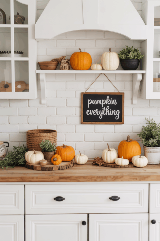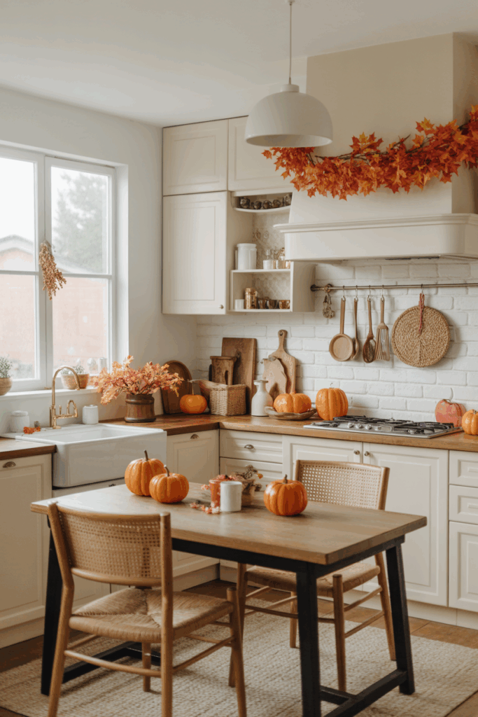 Decorate countertops, shelves, or window sills with small real or faux pumpkins. Mix different sizes, shapes, and colors for variety. Velvet, ceramic, wooden, and neutral-tone pumpkins are popular for modern fall kitchen decor.