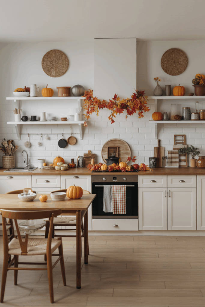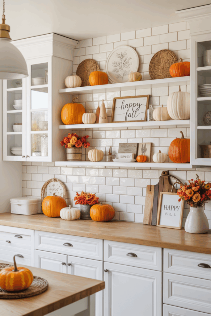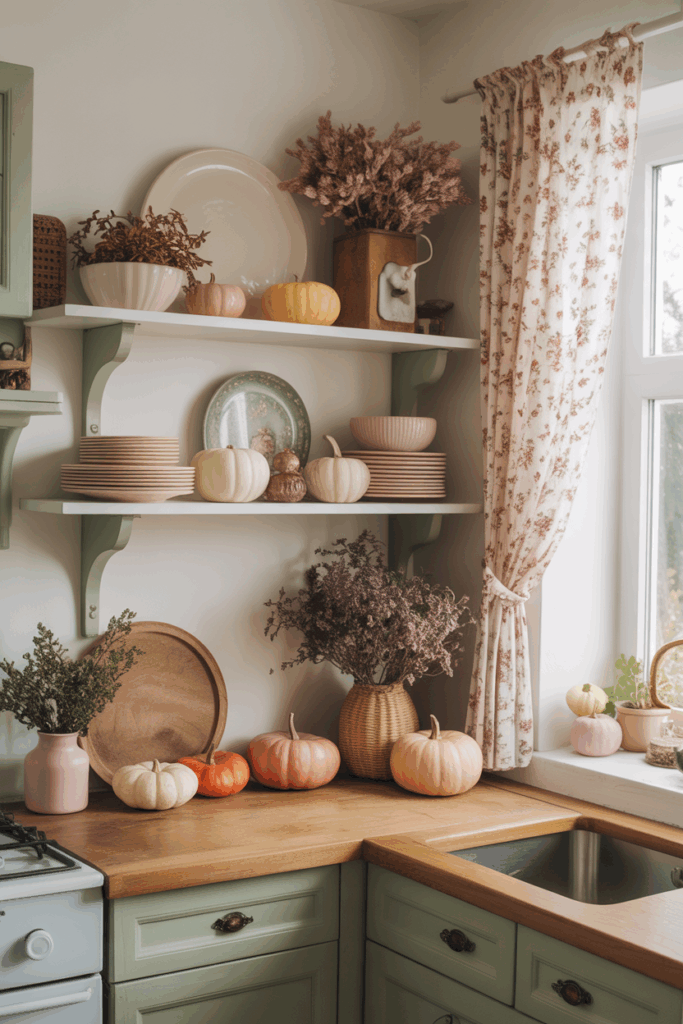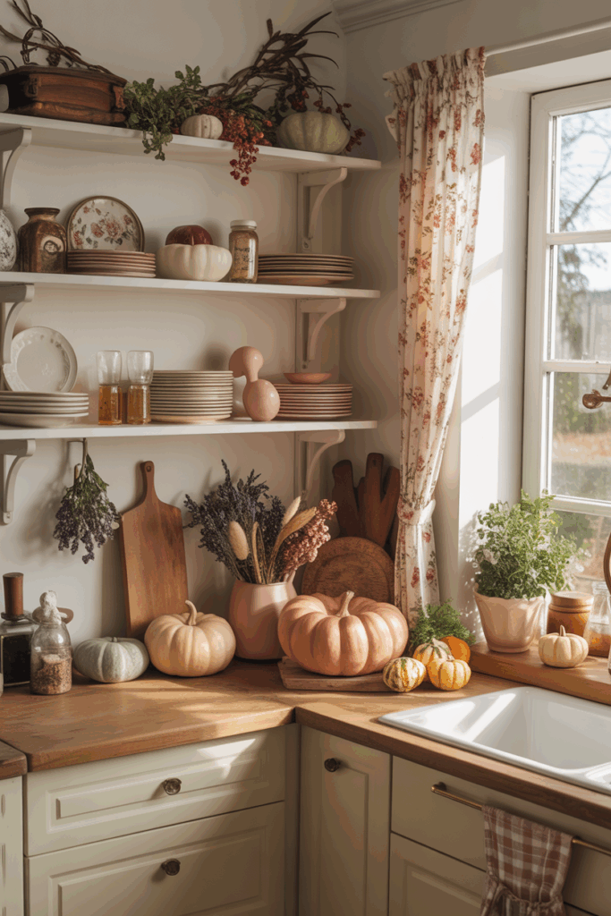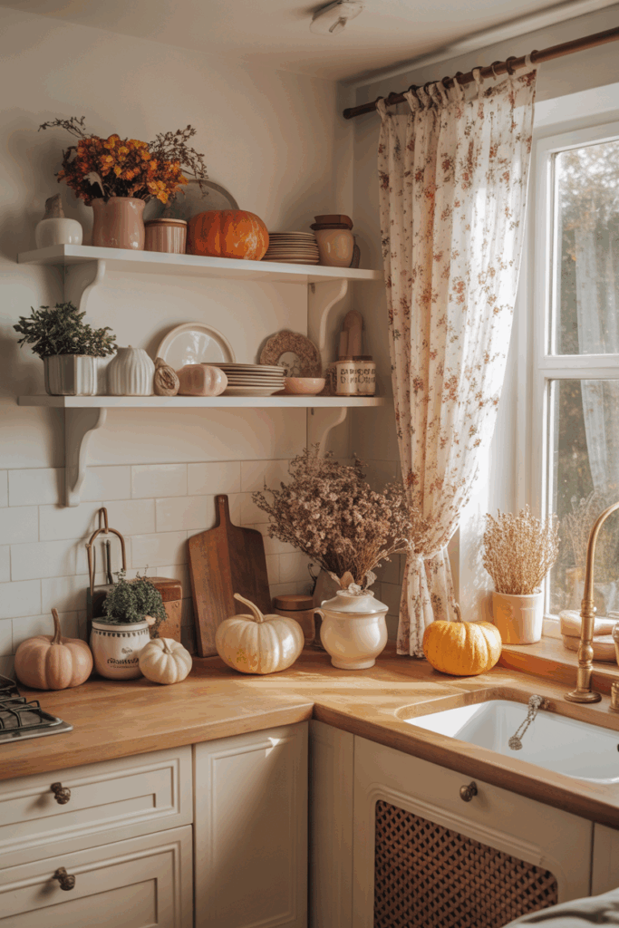 If your kitchen has open shelves, use them to showcase seasonal decor like fall mugs, small signs, dried florals, amber bottles, and ceramic pumpkins. Layer items to create depth and visual interest.