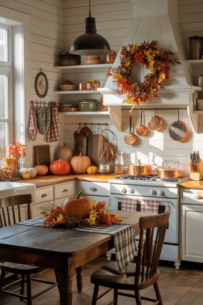 Warm metallics like copper, brass, and bronze blend beautifully with fall colors. Display copper pots, measuring cups, or utensil holders for a subtle autumn glow.
