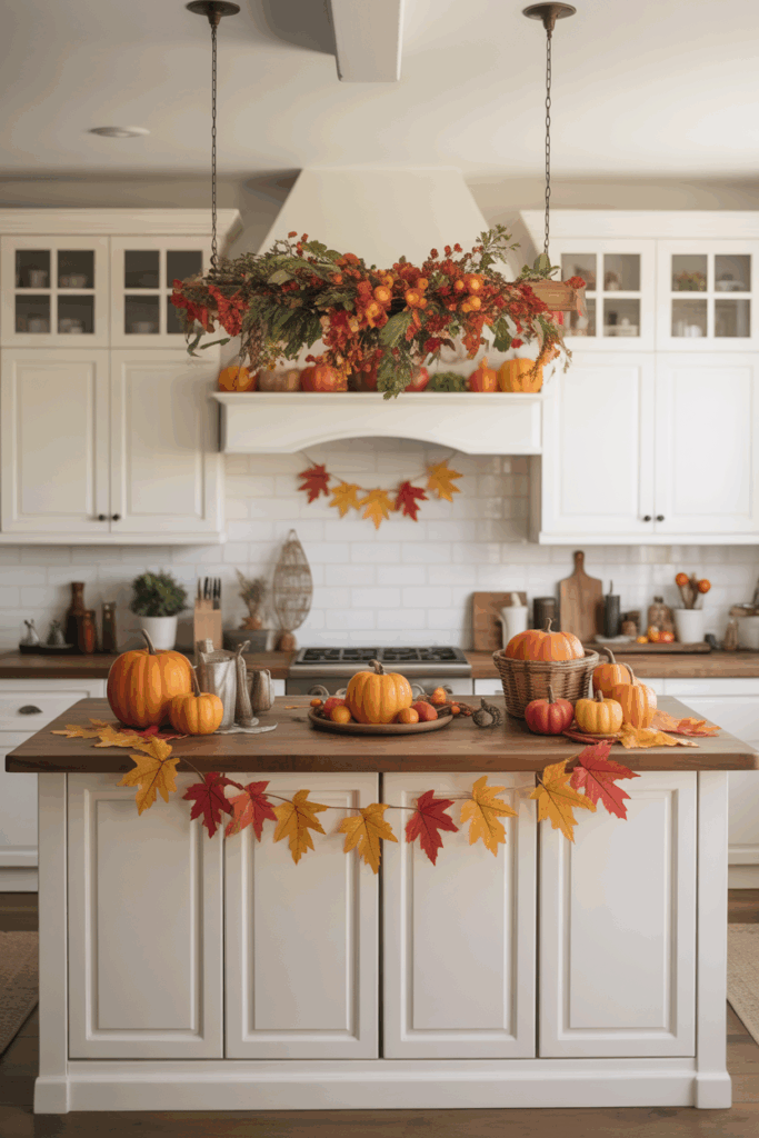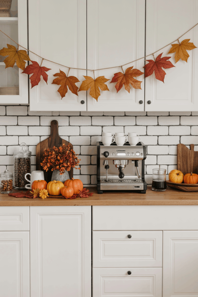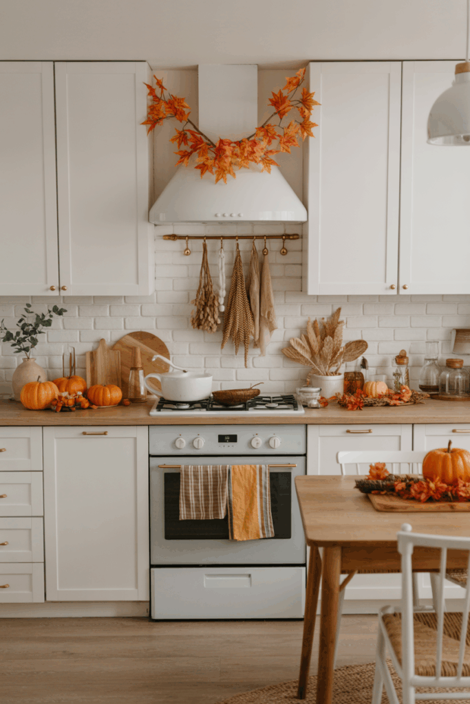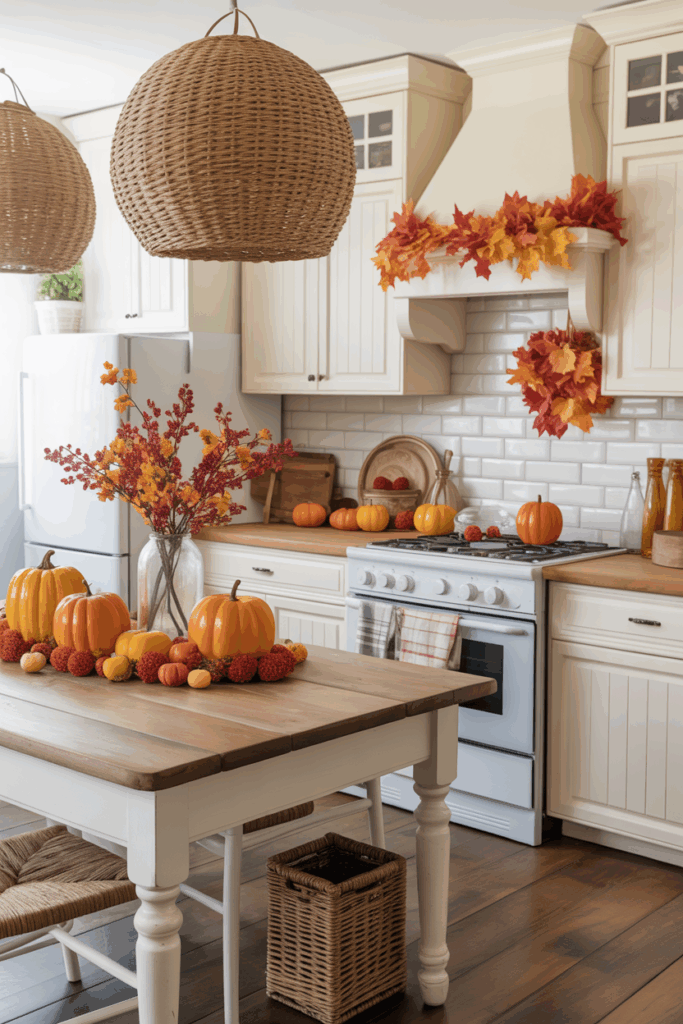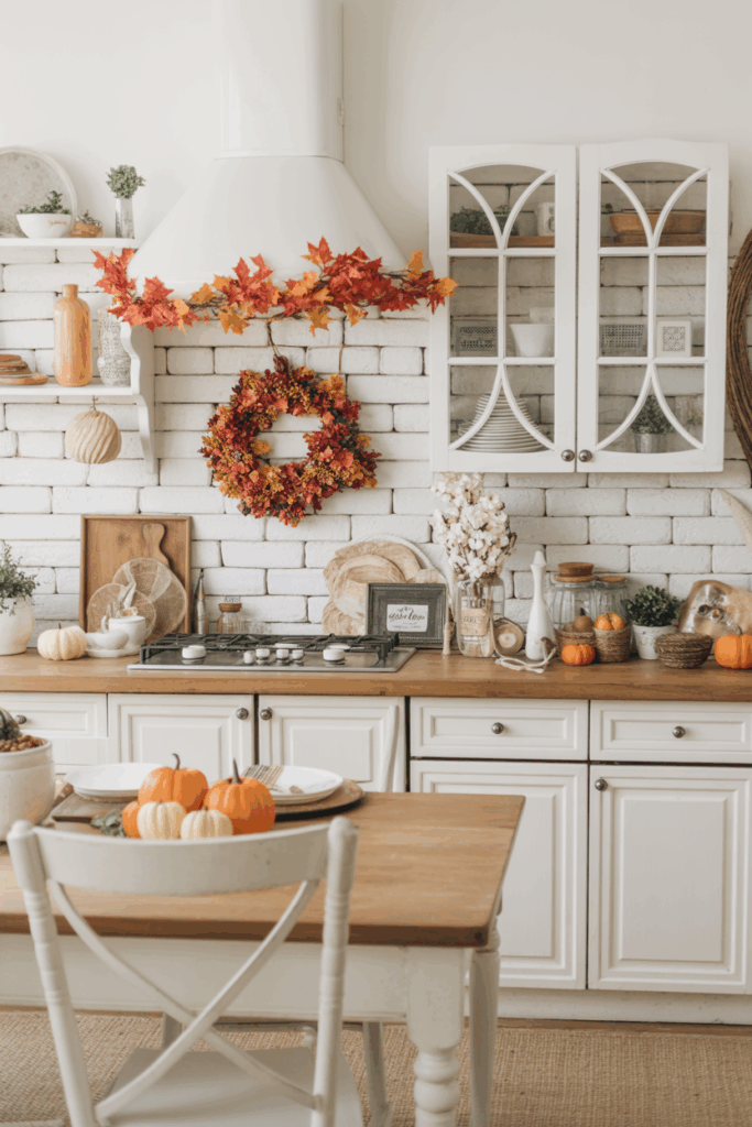 Hang a small fall wreath on your pantry door, range hood, or wall. Choose one made from eucalyptus, wheat, or faux leaves. Drape a garland across a window, above cabinets, or on open shelving for an extra cozy vibe.