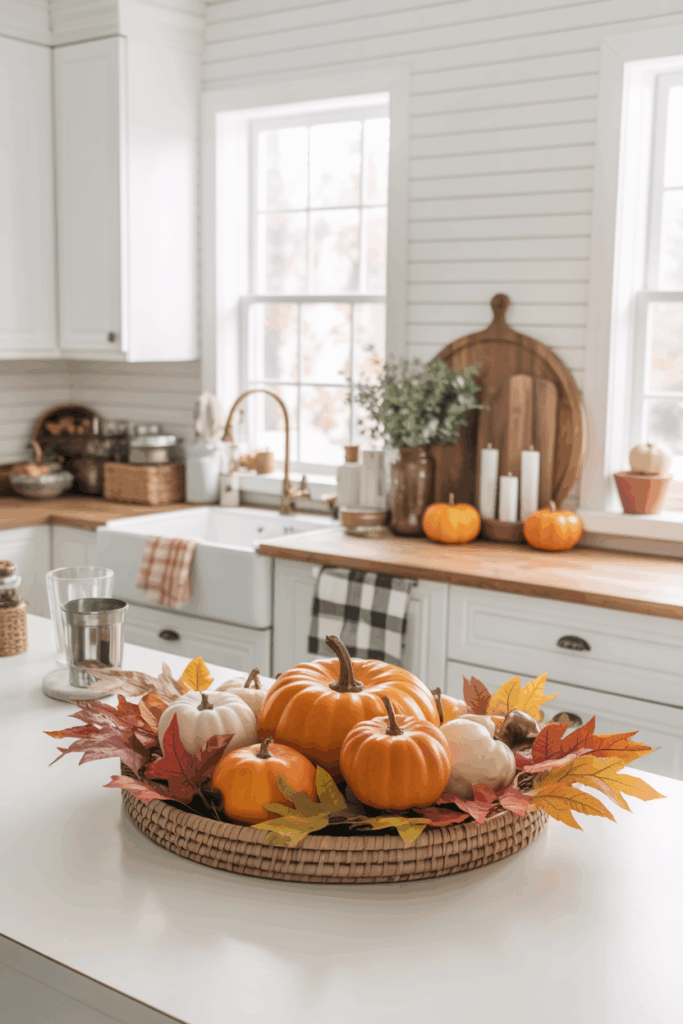 Style your kitchen island or dining table with a seasonal centerpiece. Use a wooden tray or bowl filled with pumpkins, pinecones, faux leaves, candles, and small gourds. Add height with a fall floral arrangement in a ceramic or glass vase.