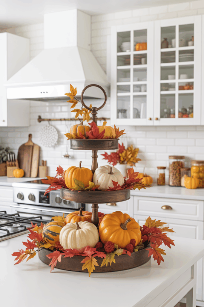 A tiered tray is perfect for fall decor. Fill it with mini pumpkins, mugs, acorns, harvest signs, cinnamon sticks, and faux foliage. Use neutral tones or vibrant fall colors to match your kitchen’s aesthetic.