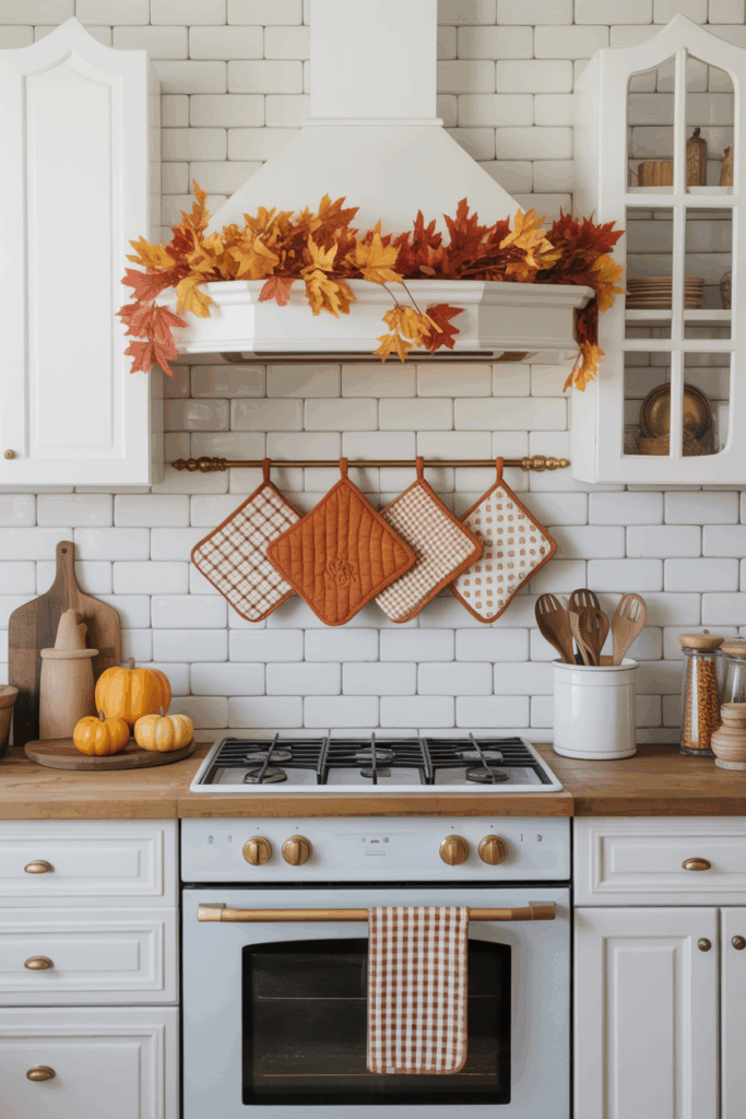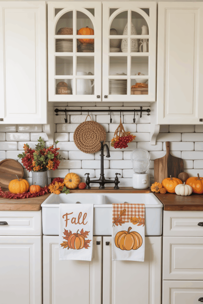 For an extra cozy effect, drape a folded fall-themed tea towel over your oven handle or tuck one into a basket display for a casual, lived-in look.